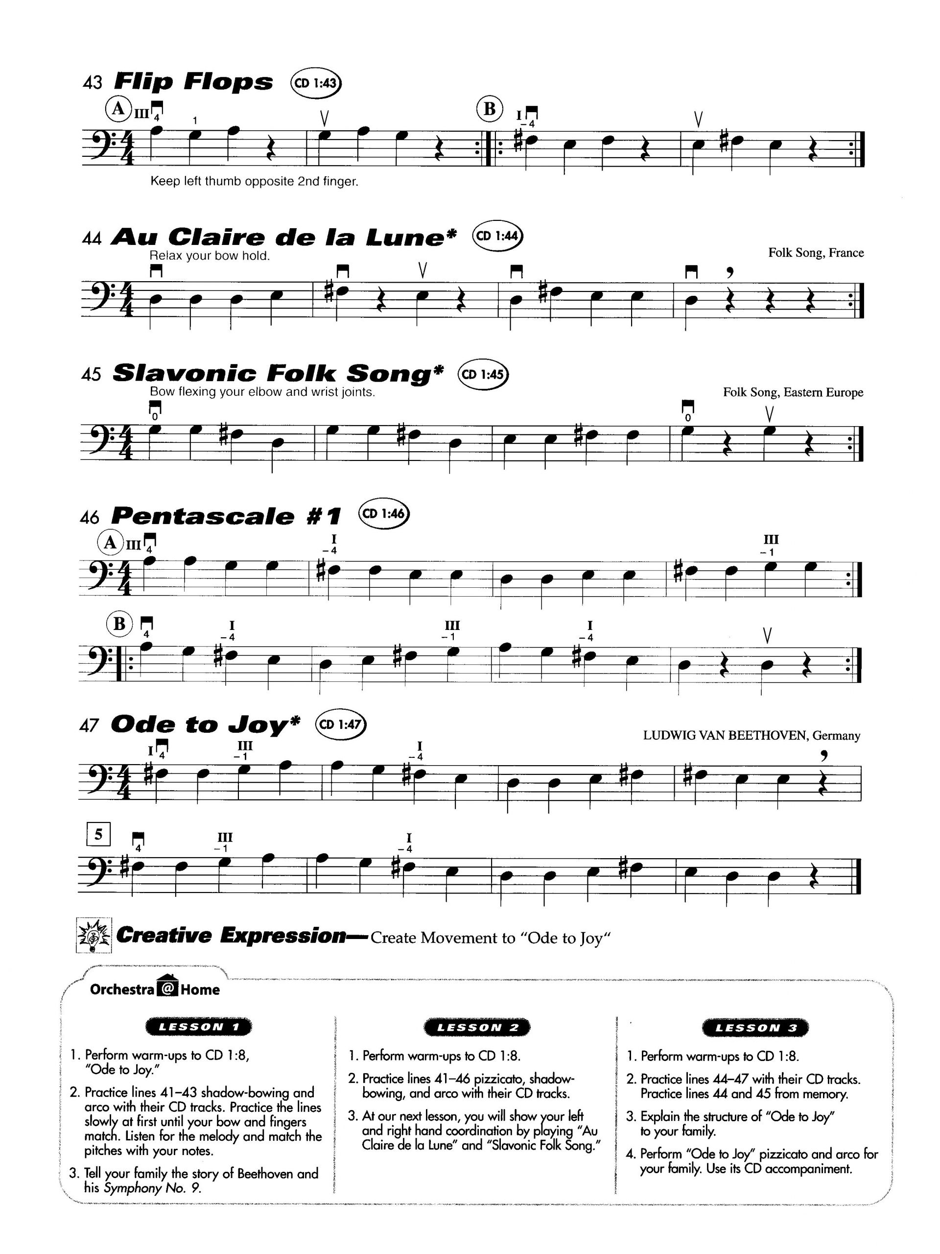 Orchestra Expressions™ provides music educators at all levels with easy-to-use, exciting tools to meet daily classroom challenges and bring new vibrancy and depth to teaching music. The lessons were written based on the National Standards for the Arts in Music — not retro-fitted to the Standards. The program is music literacy-based and satisfies reading and writing mandates in orchestra class. The pedagogy involves a “four-fingers-down” start for every instrument and separate but simultaneous development of both hands.