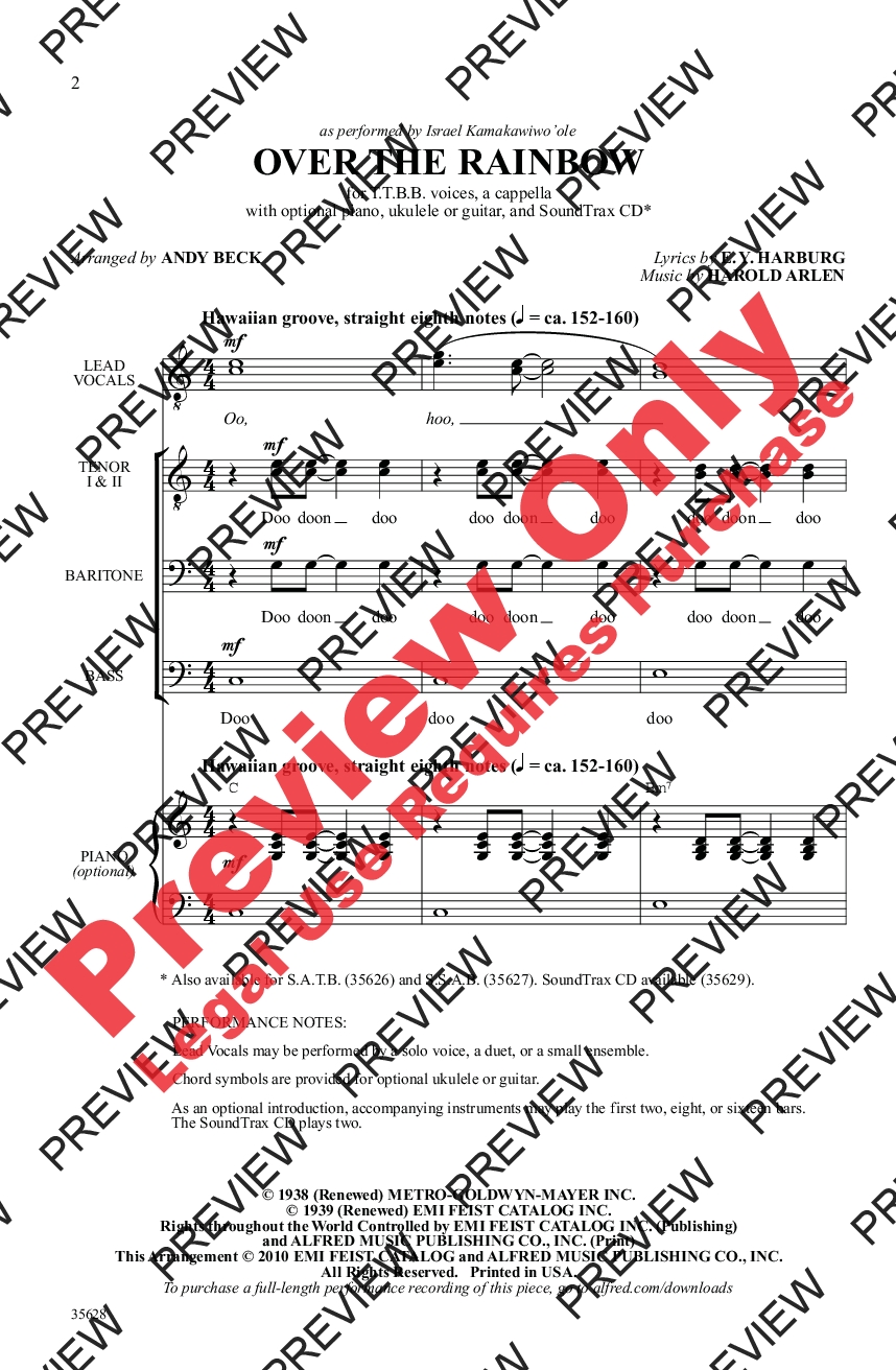 Israel Kamakawiwo'ole's Hawaiian-style “Over the Rainbow” has become a prevalent part of today's popular music. Performed in Glee's first season finale by Matthew Morrison and Mark Salling, the unique setting has been sung by several American Idol contestants and featured in many TV shows and movies. In this creative arrangement, a divisi choir accompanies the soloist, duet, or small group, performing a cappella or with optional piano, ukulele, or guitar.