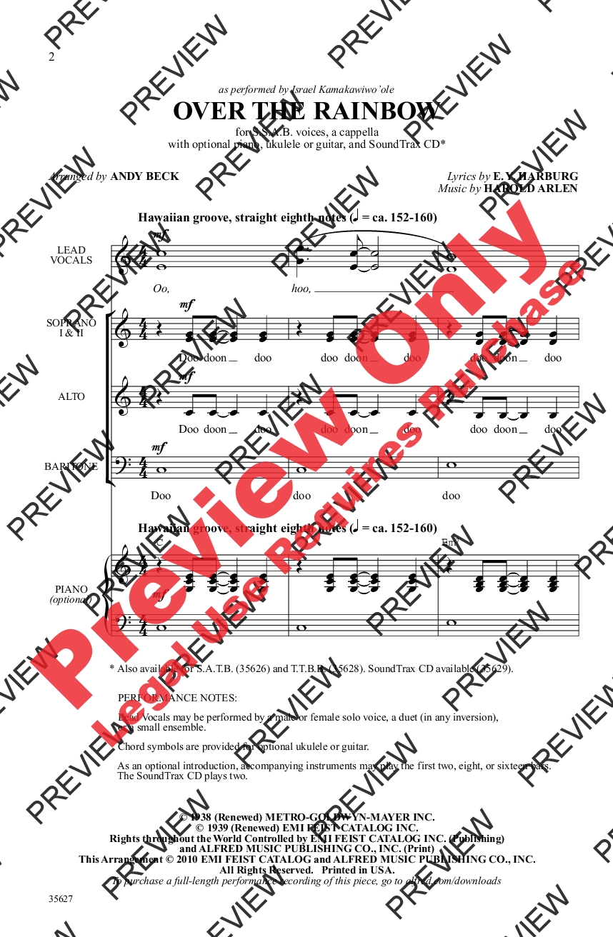 Israel Kamakawiwo'ole's Hawaiian-style “Over the Rainbow” has become a prevalent part of today's popular music. Performed in Glee's first season finale by Matthew Morrison and Mark Salling, the unique setting has been sung by several American Idol contestants and featured in many TV shows and movies. In this creative arrangement, a divisi choir accompanies the soloist, duet, or small group, performing a cappella or with optional piano, ukulele, or guitar.