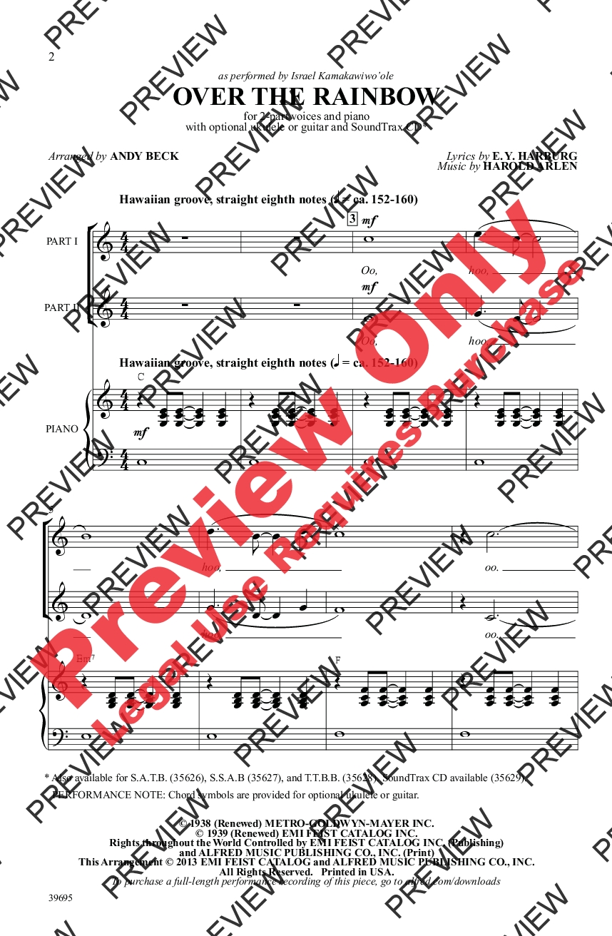 Israel Kamakawiwo'ole's Hawaiian-style “Over the Rainbow” has become a prevalent part of today's popular music. Performed in Glee's first season finale by Matthew Morrison and Mark Salling, the unique setting has been sung by several American Idol contestants and featured in many TV shows and movies. In this creative arrangement, a divisi choir accompanies the soloist, duet, or small group, performing a cappella or with optional piano, ukulele, or guitar.