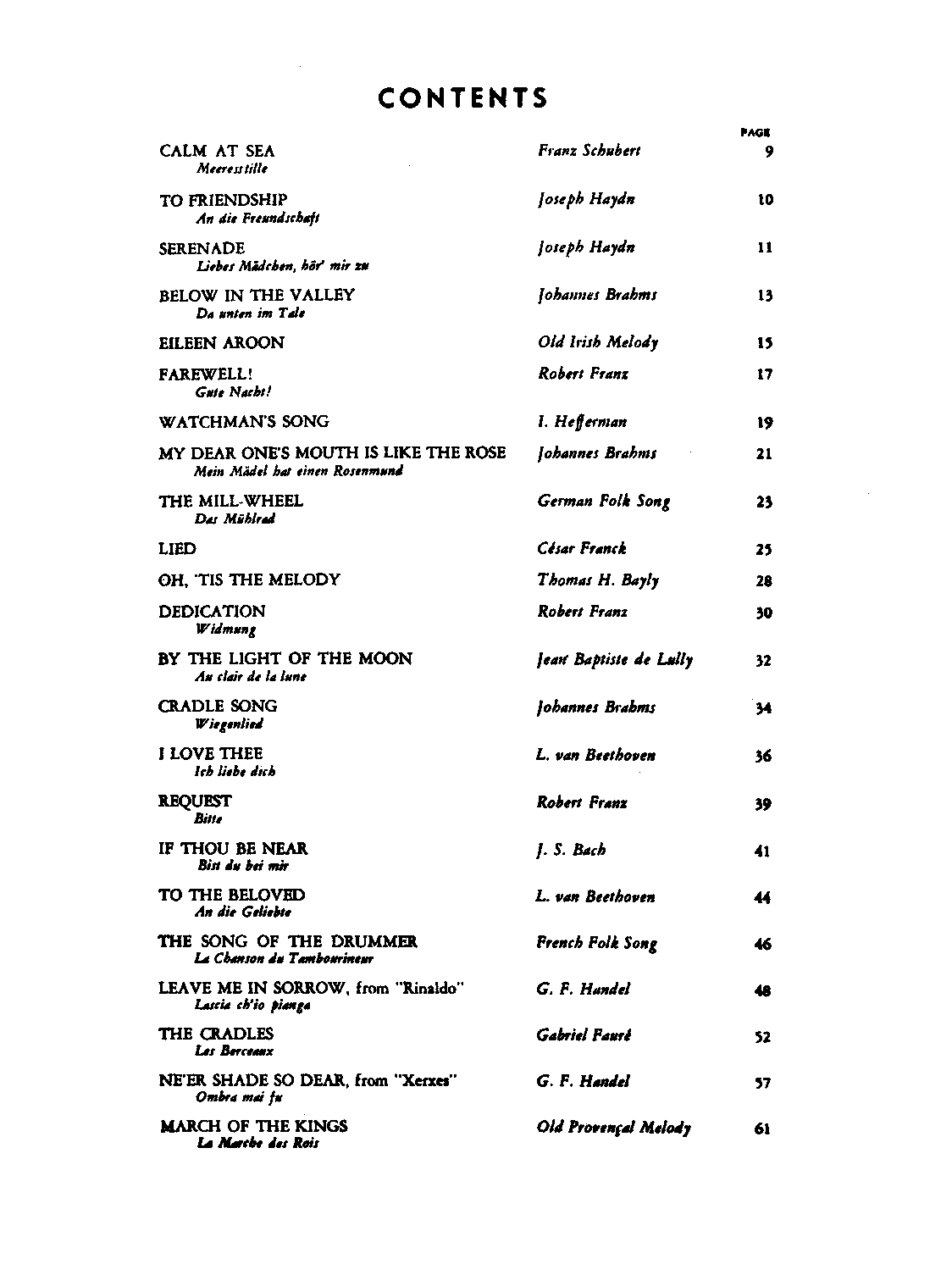 The Pathways of Song series offers concert songs in easy vocal ranges for the voice student, by composers such as Schubert, Brahms, Handel, Bach, Mozart, Beethoven, and Haydn. The series includes representative repertoire, with English translations and piano accompaniment.
