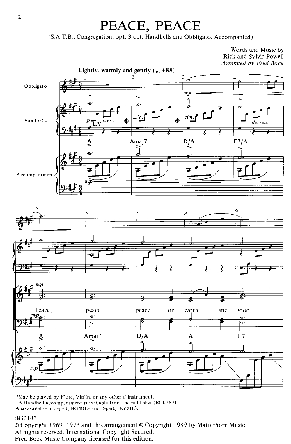 With well over a million copies sold, 'Peace, Peace' may be the most favored partner song to 'Silent Night' ever. Arranged by Fred Bock, this is an excellent finale for any Christmas season holiday concert or service.