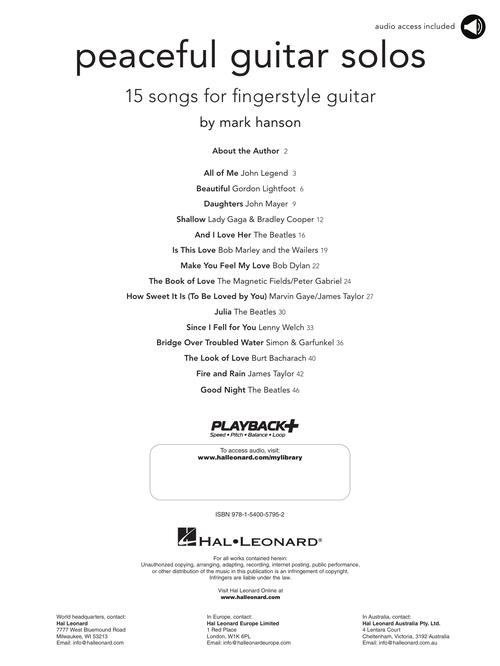 Relax with your guitar with this exceptional collection of satisfying and profoundly beautiful pieces to play. These arrangements, by Grammy Award winning fingerstyle guitarist Mark Hanson, are presented in standard notation and tab. Online access to his recordings of these pieces is also included. This collection is designed for all fingerstyle guitarists wanting to unwind with these tranquil selections.