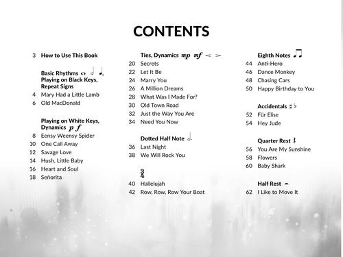Designed with the beginner in mind, Piano Songs for the Very Beginner features popular, easy-to-play melodies in pre-staff notation, perfect for those in their first months of learning. Arrangements consist of simple rhythms, letter names inside each note, minimal hand movement, and no page turns. This book is a perfect supplement for students needing extra playing material, with each song including playing tips and fingering diagrams. The songs are presented in order of difficulty. The written piano accompaniments can be played by a teacher or friend, or you can play along with the recorded accompaniments.