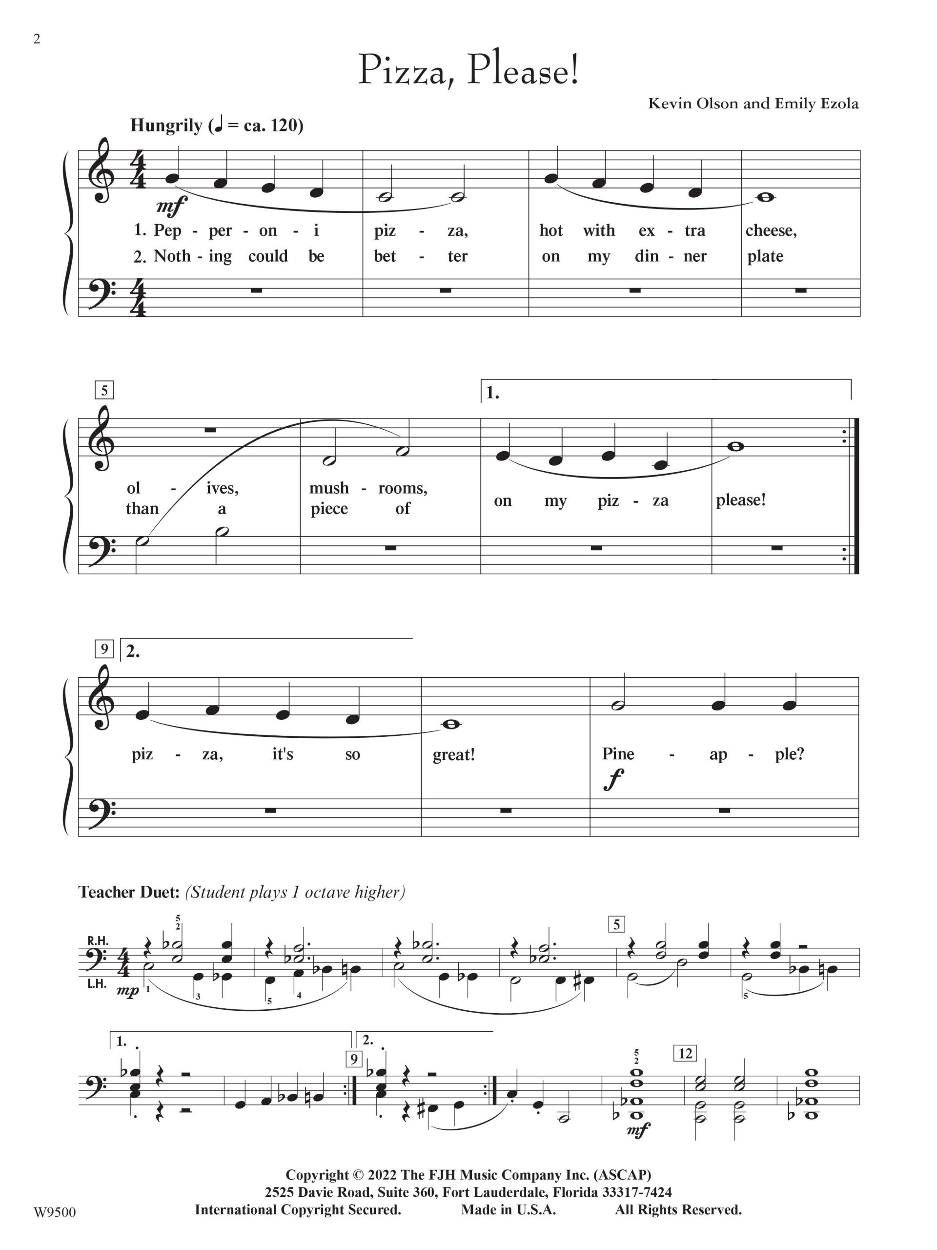 In this early elementary solo, students can learn to get comfortable on the keyboard, using thumbs on middle C. The end of the piece lets students jump to find a C in different octaves. There is an optional teacher accompaniment, and delicious lyrics that will have students begging their parents for pizza.