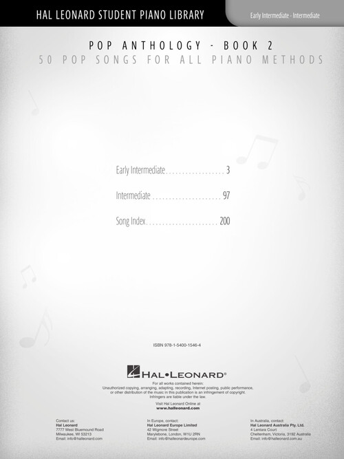 Being able to play songs you recognize soon after beginning piano lessons can be a key toward motivating students and boosting confidence as the building blocks to playing the instrument are starting to develop. This collection picks up where Volume 1 leaves off with 50 songs for early to mid-intermediate level pianists – perfect for users of the Hal Leonard Student Piano Library or any piano method.