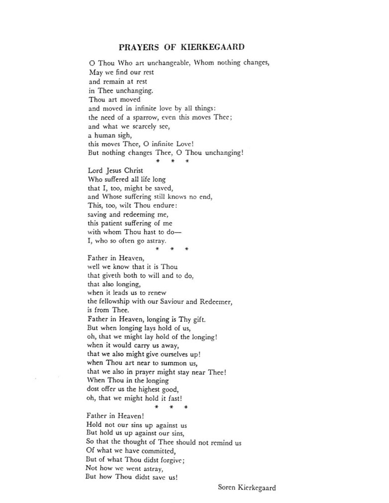 Prayers of Kierkegaard, Op. 30, is an extended one-movement cantata written by Samuel Barber between 1942 and 1954. The piece has four main subdivisions and is based on prayers by Søren Kierkegaard. It is written for chorus, large orchestra, soprano solo, and incidental tenor and alto solos.