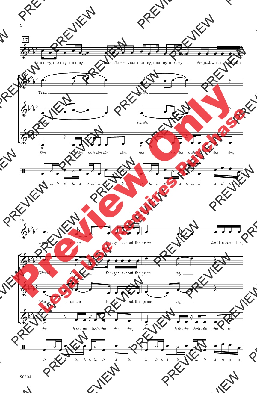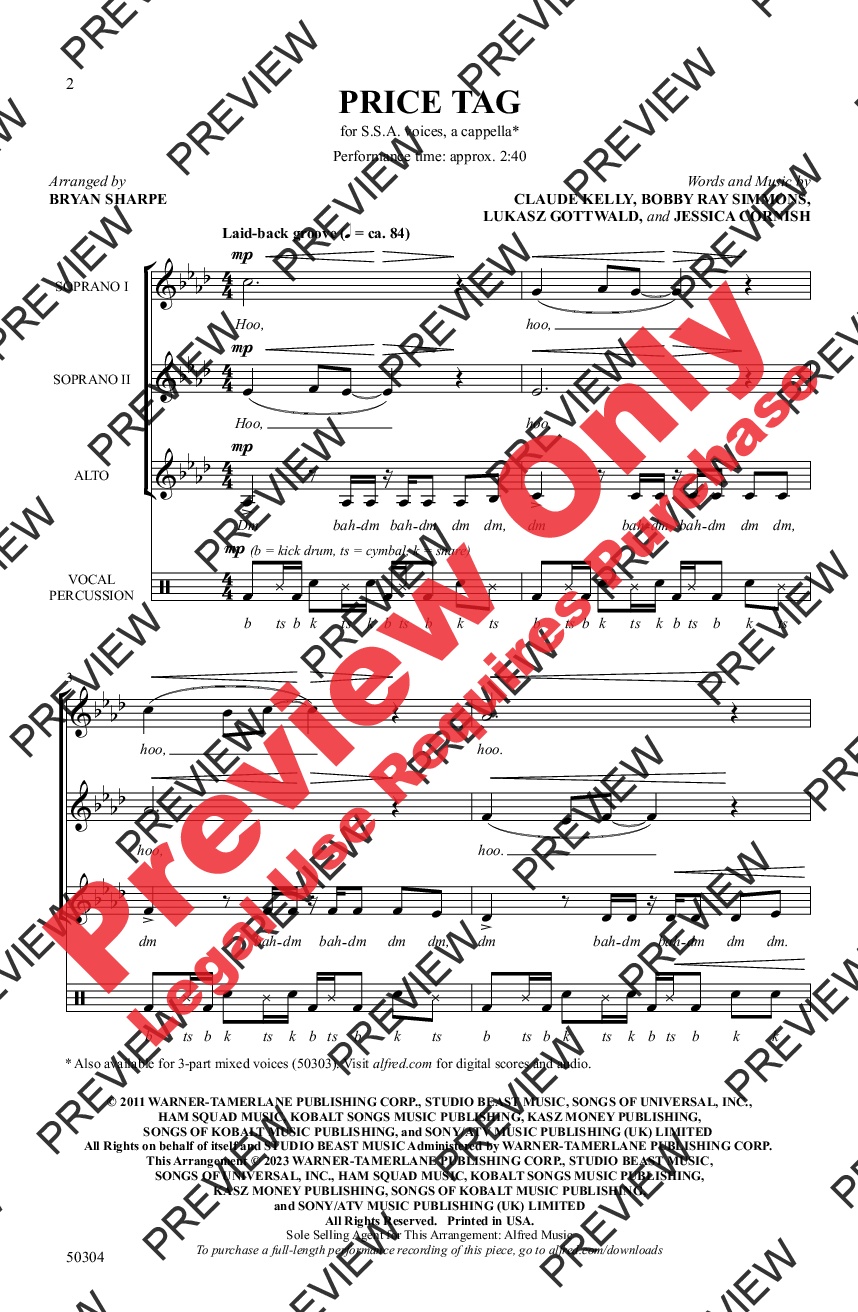 Jessie J's most recognizable hit was featured in the fan-favorite movie Pitch Perfect. This contemporary a cappella treatment is just right for developing groups. Three conservative voice parts, a moderate-range solo (or small group), and notated vocal percussion pave the way for teens to successfully perform this popular style.