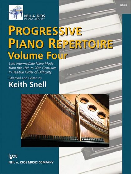 Progressive Piano Repertoire, Volume Four, is a collection of late intermediate piano pieces from the 18th to 20th centuries arranged in relative order of difficulty. It is specifically designed to be used after Progressive Piano Repertoire, Volume Three (GP484.) After completing Volume Four, students will be prepared for Level Eight of Keith Snell’s Piano Repertoire (Baroque & Classical, Romantic & 20th Century) or Essential Piano Repertoire series.