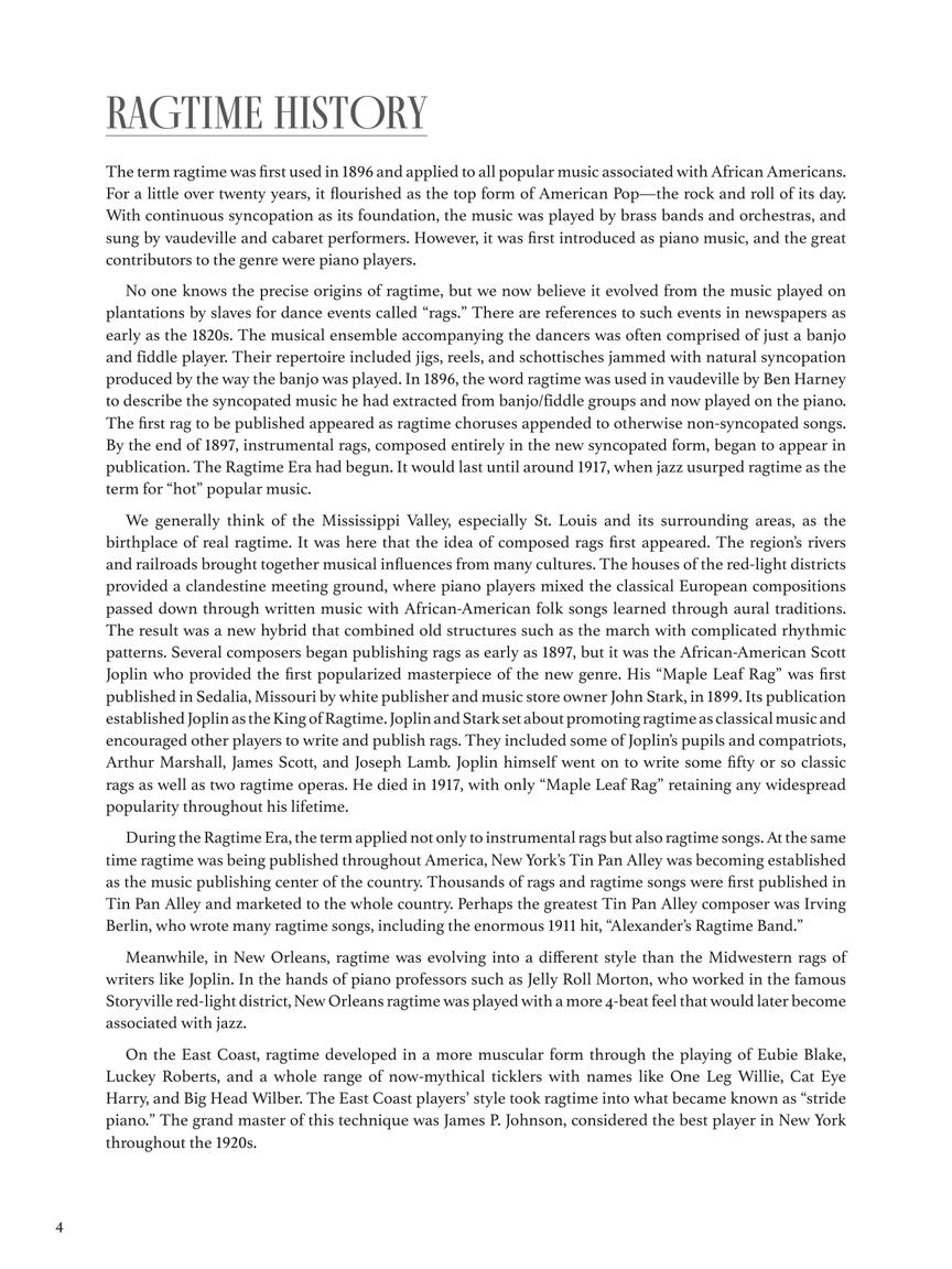 Includes: Easy-to-read, modern sheet music for some of the most popular rags, including “The Entertainer,” “Maple Leaf Rag,” and “Mississippi Rag”; Techniques for composing and arranging ragtime music; Performance considerations; Historical overview; and more!