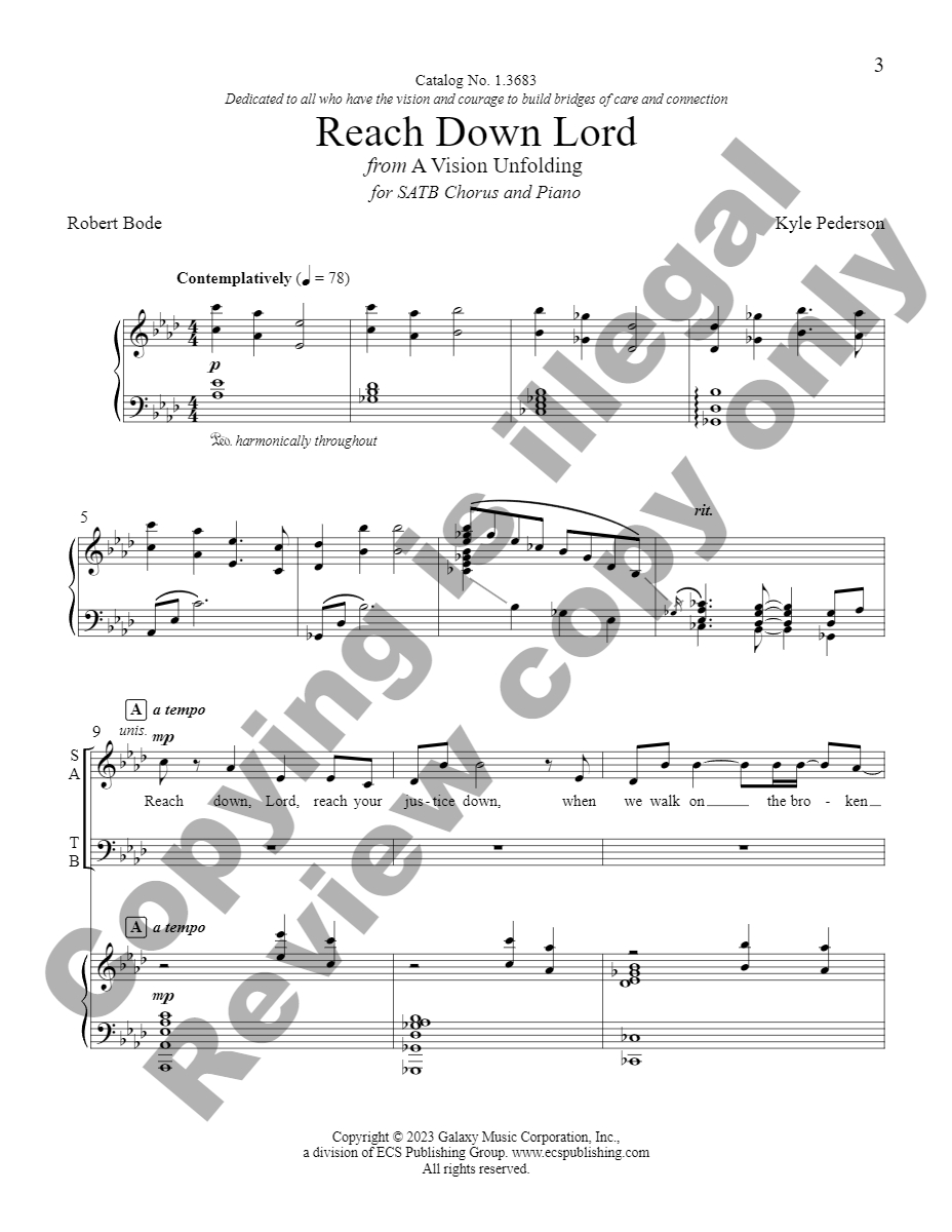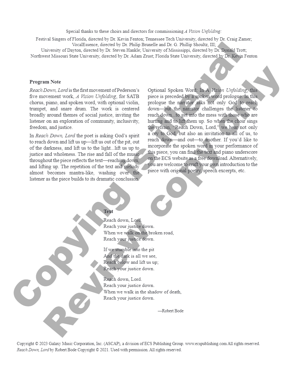 The first movement of Pederson’s powerful five movement work, A Vision Unfolding. This gospel style-inspired piece, appropriate for both sacred and secular settings, provides a powerful introduction to themes of justice and trial/tribulation.