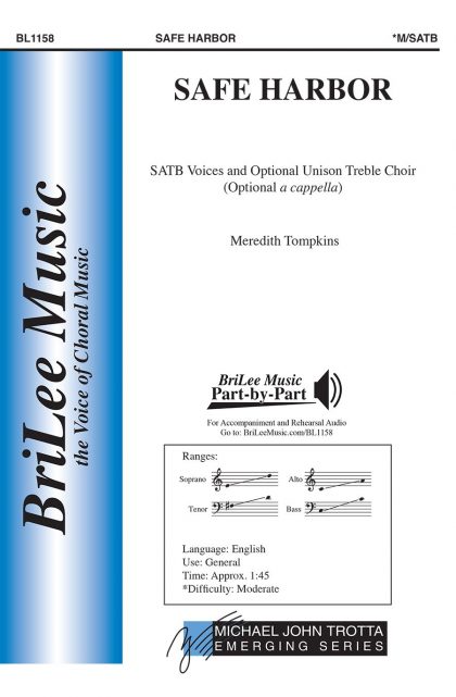 Featuring expressive vocal lines, warm harmonies, lush choral texture and a meaningful text, Safe Harbor is a modern benediction that conveys feelings of safety, belonging, and well-being. This piece allows for performance flexibility: it may be sung a cappella or with piano, and it includes the option of adding a unison treble or elementary choir for combined feeder concerts.