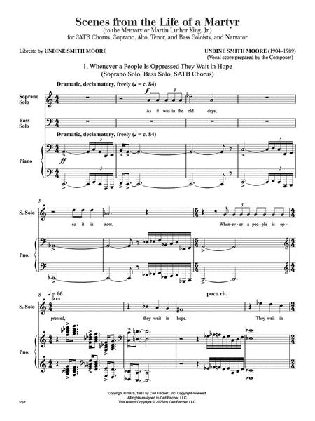 This epic work is is a musical depiction of Martin Luther King, Jr.'s life: from birth, to adolescence, to adulthood, to his marriage to Coretta Scott, to his missionary work, to his assassination and finally to his afterlife. Scored for SATB Chorus, four vocal soloists, narrator, and orchestra, the 40-minute piece consists of 16 movements. This is the first engraved edition of the vocal score with piano reduction. Undine Moore became the first African American woman composer to earn a Pulitzer Prize nomination for the original orchestra score. Moore drew the text from various sources, including the Bible and spiritual songs. While the piece does not follow any particular form or structure, the musical styles change from beginning to end, corresponding to King’s growth. The piece starts with settings of spirituals (representing his mother singing to him), very straightforward and accessible. Once the piece moves into King’s adulthood, styles change and become more individualistic, more personal for the composer, and more idiomatic of 20th century styles, particularly in terms of its harmonic vocabulary and orchestration.