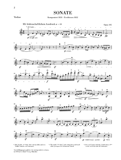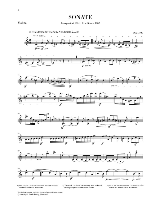 The famous, wonderful first of Schumann's three late violin sonatas, that in A minor op. 105, was written in just a few days in September 1851. In regard to publication of the present edition, violinist Florian Sonnleitner remarked that he loved to play this one so much because “very compact in form, and in the merciless key of A minor, it is one of the most direct mirrors of Schumann's inner life.” The Henle Urtext edition is based on the autograph and on Schumann's working copy of the first printing.
