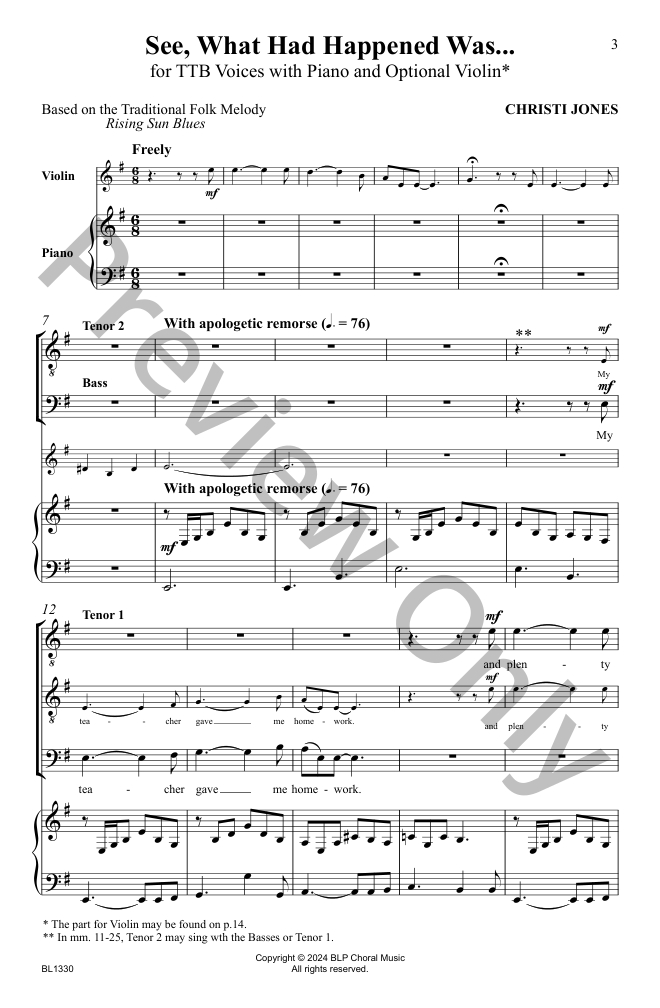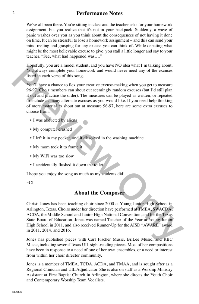 Jones, herself the mother of two TB singers, wrote this delightfully playful song that is laden with “fun” reasons why those singers did not turn in their homework! See, What Had Happened Was… is novel, funny, and extremely singable!