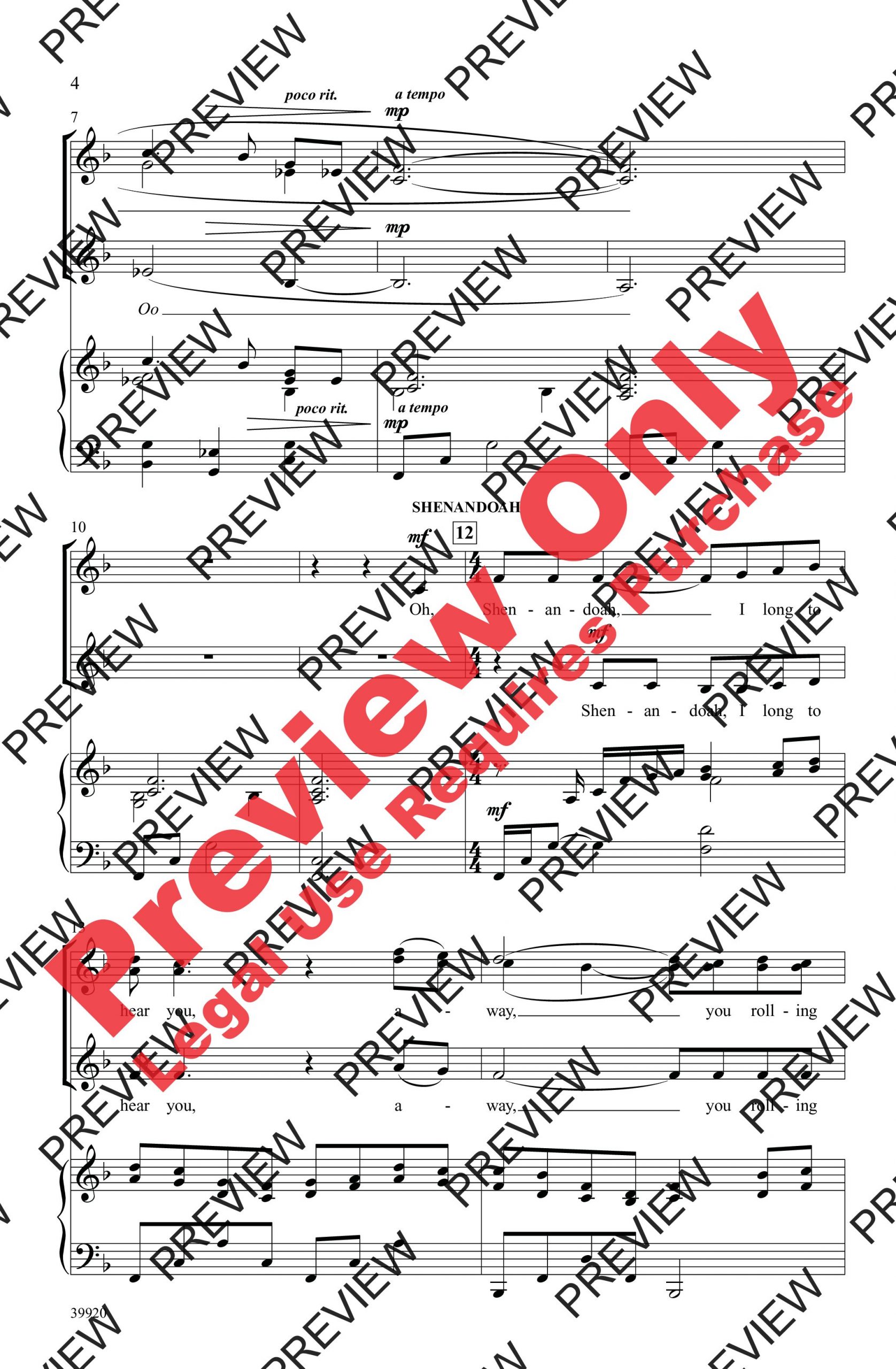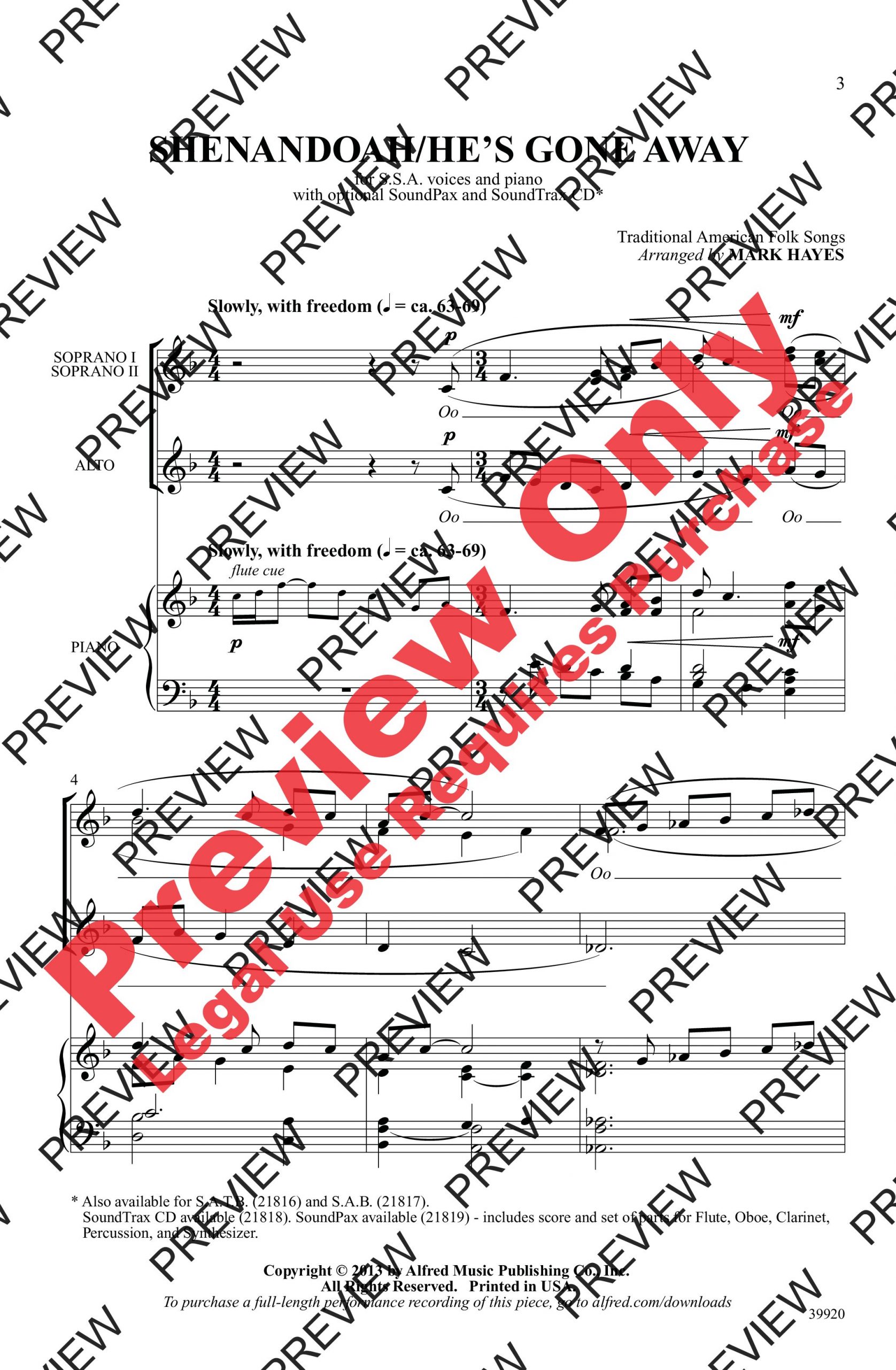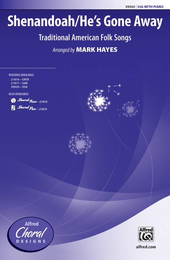 A breathtaking combination of two simple folks songs. Mark Hayes has a tremendous gift for bringing the best qualities out of a simple musical idea. His artistic treatment of these two standards from the folk song repertoire will raise your choir to a new level of excellence. Harmonically rich and opulently expressive. The flowing sixteenth notes in the piano accompaniment paint a clear picture of a rolling river in Shenandoah, and the multi-metered setting of He's Gone Away augments the melody into a form that would surely draw you back ten thousand miles. Stunning when performed with live woodwinds and percussion, or the gorgeous SoundTrax.