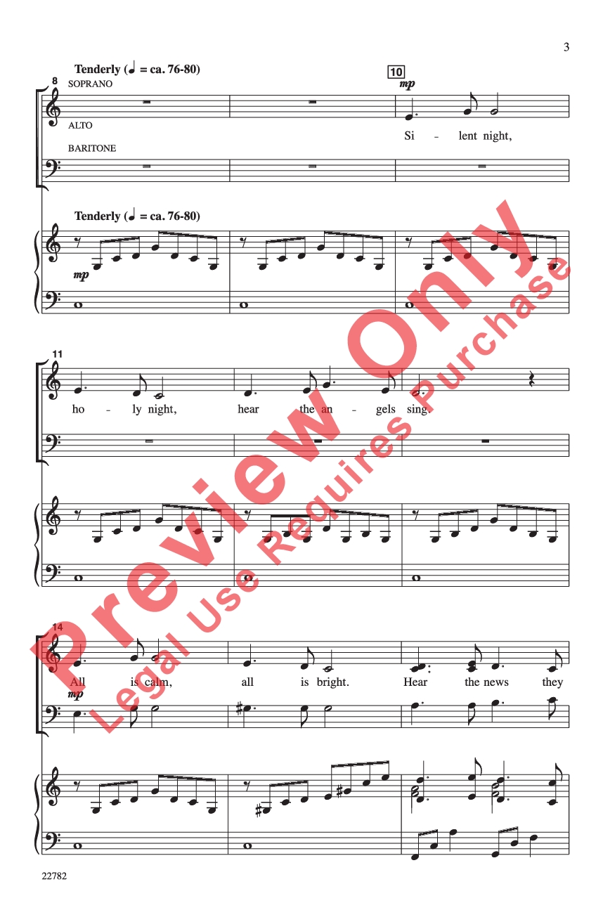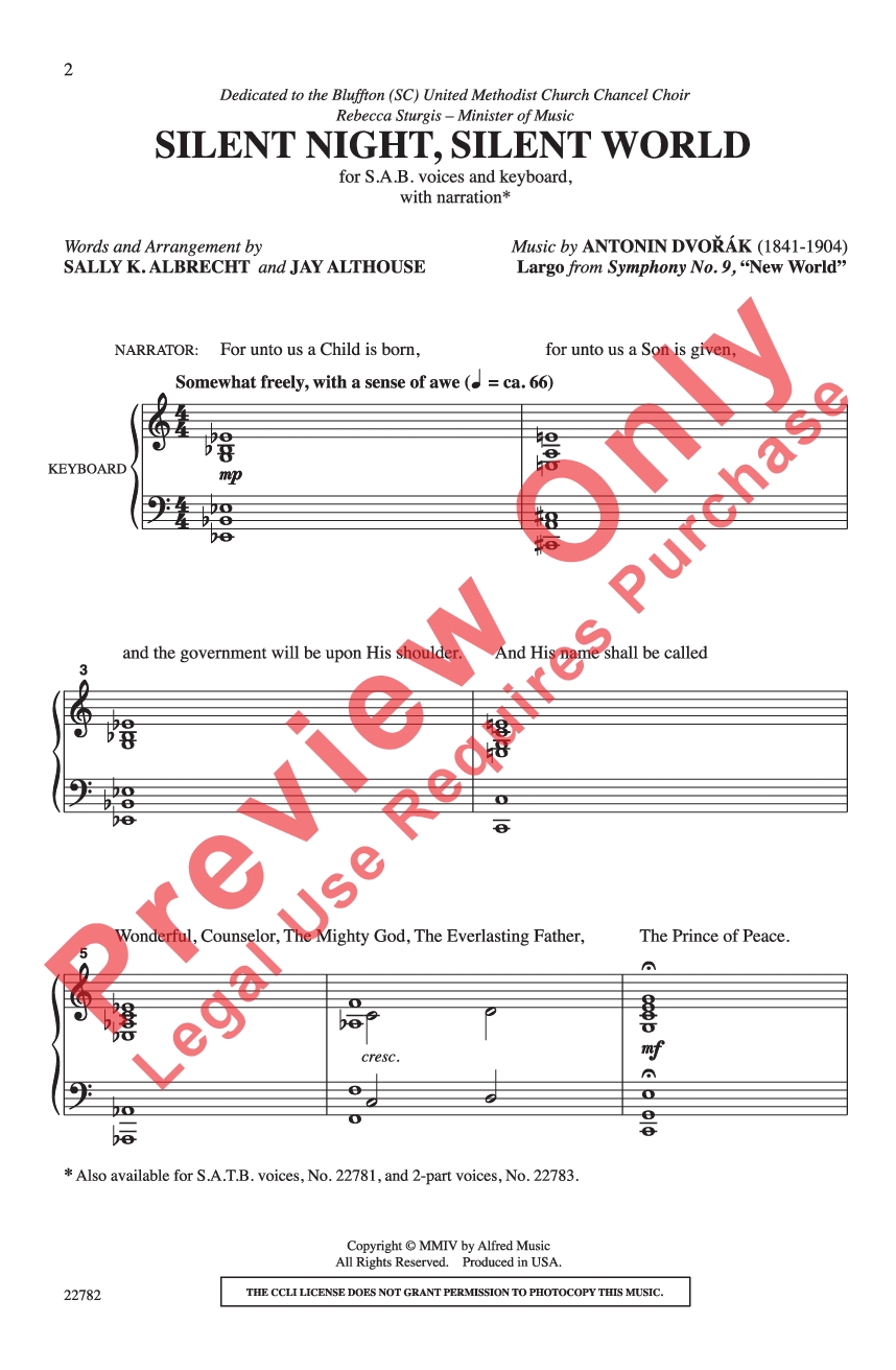 Awe-inspiring! Above the slow opening strains of Dvorak's “Largo” from his “New World Symphony,” we hear the Christmas narrative: “For unto us a Child is born.” After a dramatic pause, the flowing accompaniment signals the choral response: “Silent night, holy night,” sung to Dvorak's melody, a brilliant pairing of text and melody. As the rapture continues, the choir and accompaniment swell, proclaiming, “We reflect God's true light on this Christmas morn.” We give this our highest recommendation for worship and seasonal concerts!