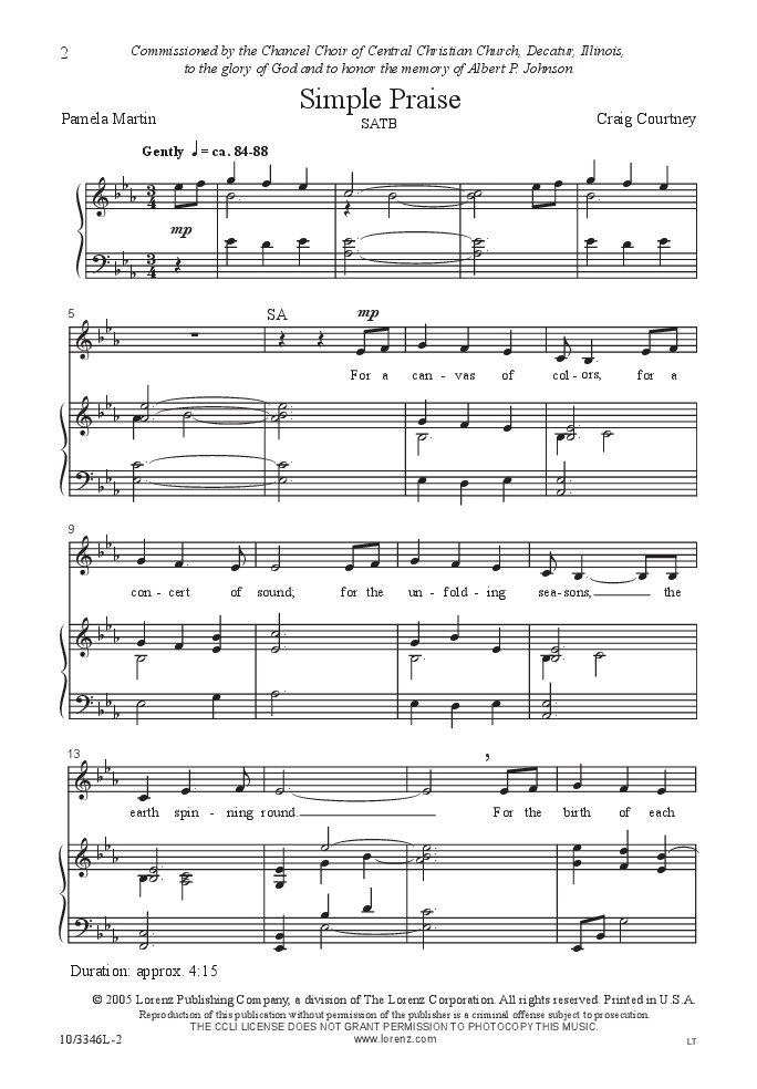 The writing partnership of Craig Courtney and Pamela Martin combines one of this generation’s pre-eminent church composers with a lyricist of equal stature. “Simple Praise” is a celebration of life’s simple gifts. Martin’s vivid prose conveys strong images of earth’s changing seasons, a mother’s loving hands, and the Creator’s limitless mercy and grace. Courtney’s compelling music magically transforms these images into an anthem of rapturous praise to God.