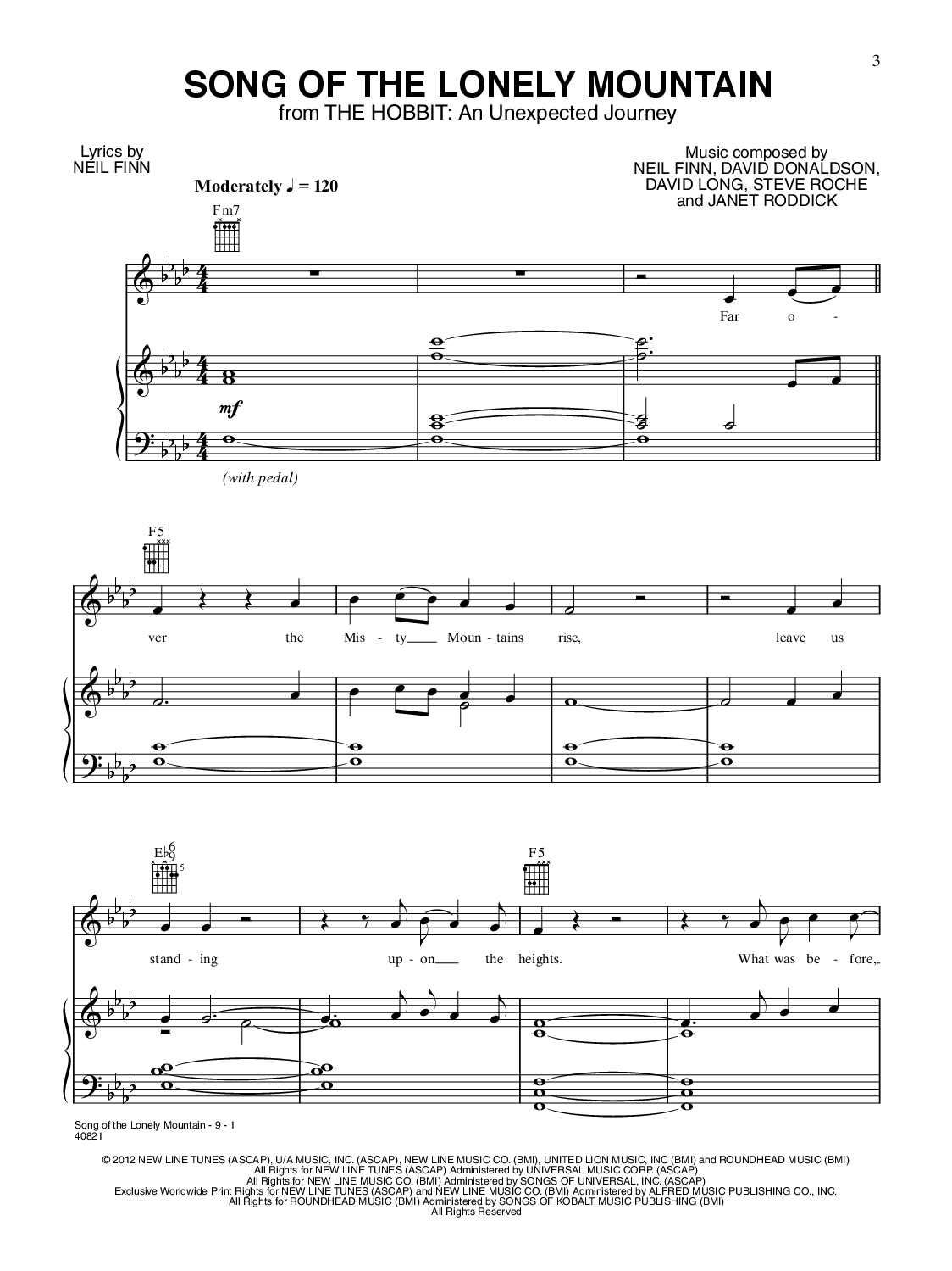 “Song of the Lonely Mountain” is the first commercially released selection from the original motion picture soundtrack of The Hobbit: An Unexpected Journey. This officially licensed piano/vocal/guitar sheet music lets music makers bring the sounds of Middle Earth to life with a Celtic-infused melody, and lyrics that foretell an epic journey.