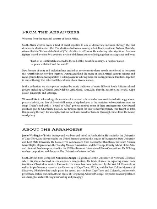 Introduce piano students to the beautiful traditional music of South Africa with these 24 folk songs arranged for piano solo. During apartheid the music of the country's various cultures and groups (Afrikaans, amaNdebele, amaXhosa, amaZulu, Bapedi, Basotho, Batswana, Cape Malay, emaSwati, Vatsonga) developed separately, and the authors felt it long overdue to bring these contrasting musical traditions together.