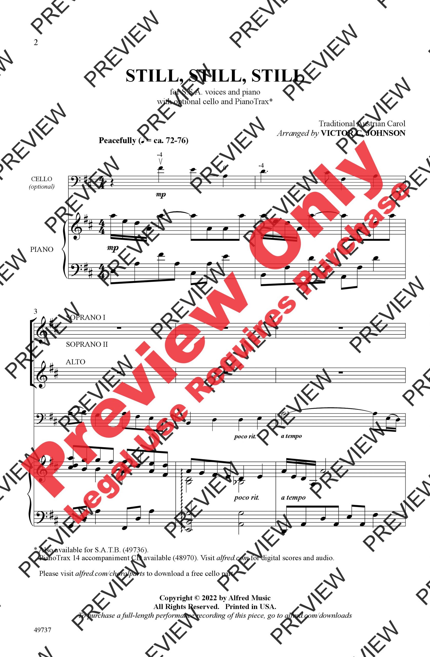 Victor Johnson lends his artful pen to the beloved Austrian carol, which proves a fitting vehicle for his sensitive signature style. Long melodic lines, generous harmonic suspensions, an intricate piano accompaniment, and a luminous cello obbligato combine to make a special moment for holiday programs. SSA and SATB singers will sound their best on this terrific treatment that is a joy to sing and a pleasure to hear.