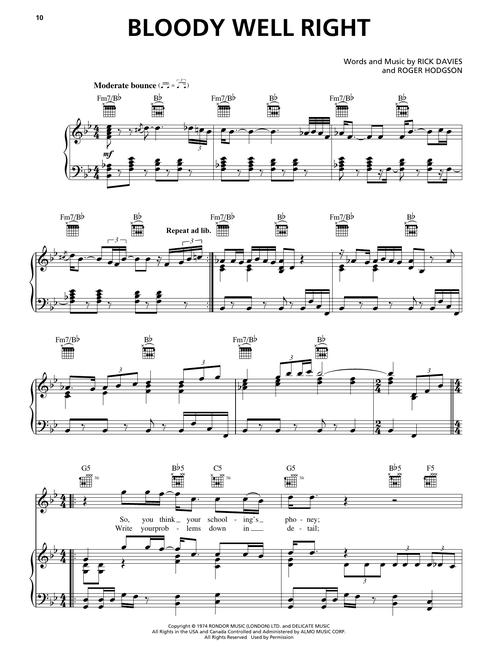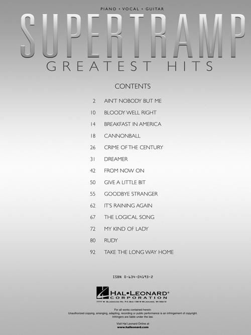 Formed in 1969 with funds donated by a Dutch millionaire, arena pop/rockers Supertramp enjoyed success for many decades following. This P/V/G collection assembles 14 of their biggest hits culled from six albums.