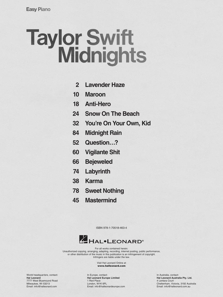 Taylor Swift's tenth studio album, Midnights, was released at midnight on 10/21/22 and immediately started breaking records. It was the most-streamed album ever in one day and its first-day sales alone made it the biggest-selling album of 2022 so far! This matching songbook features all 13 songs arranged for easy piano with lyrics.