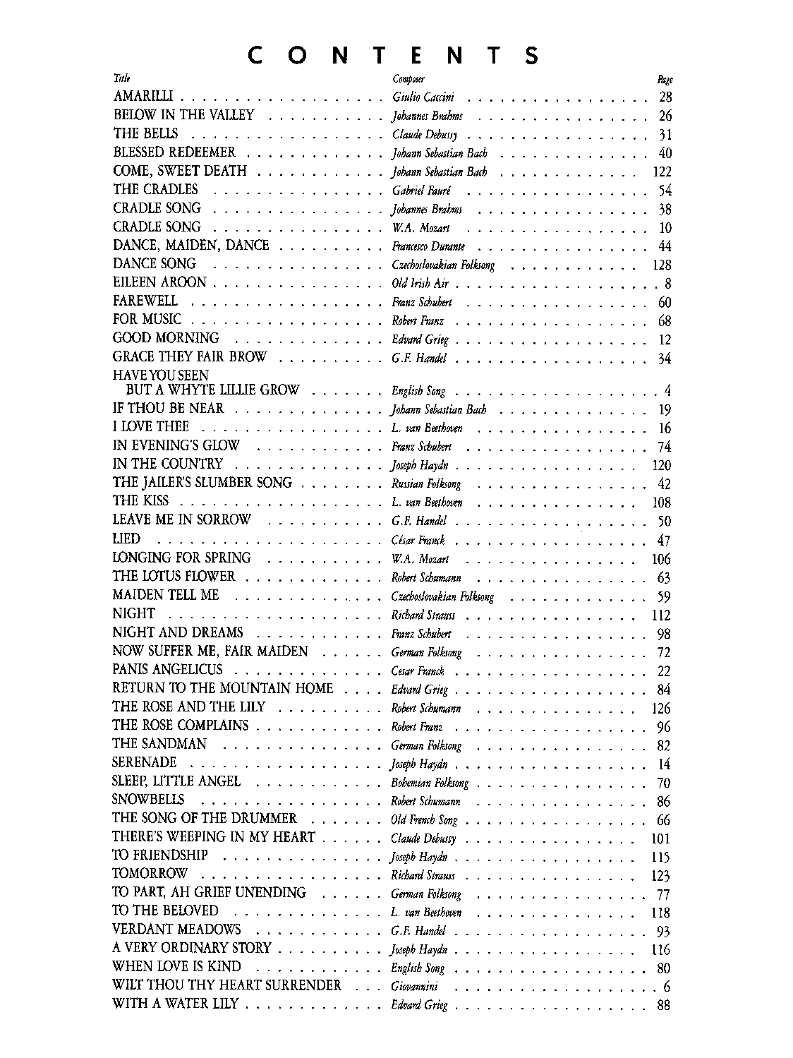 The Pathways of Song series offers concert songs in easy vocal ranges for the voice student, by composers such as Schubert, Brahms, Handel, Bach, Mozart, Beethoven, and Haydn. The series includes representative repertoire, with English translations and piano accompaniment.