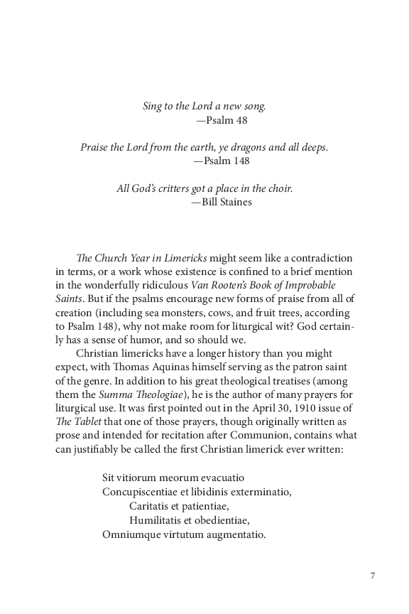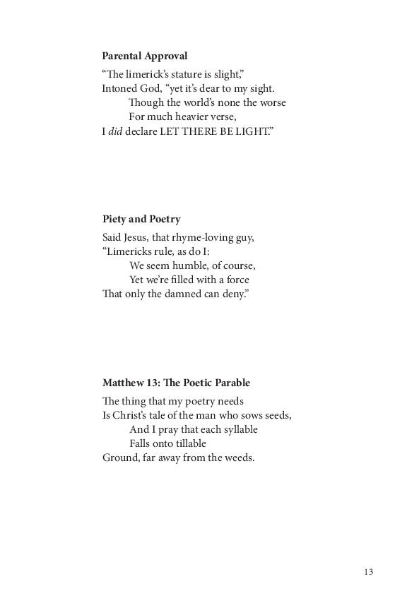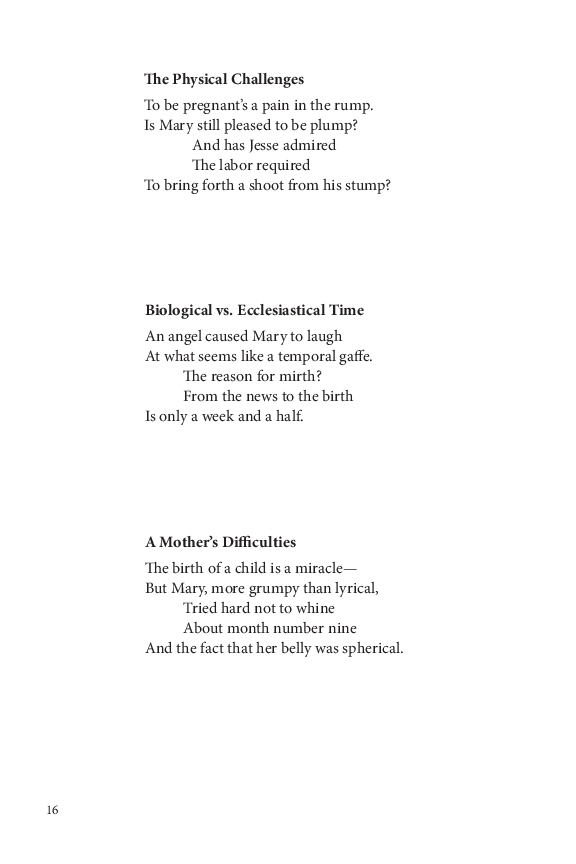 Like an Advent calendar or a box of chocolates, The Church Year in Limericks is not meant to be enjoyed all at once. Each stanza exists on its own, and reading the entire collection straight through diminishes the individuality of its separate parts. Think of this book instead as a sort of hymnal, in which all the hymns happen to be written in the same meter but each one serves a different purpose in worship: contemplation, inspiration, insight, comfort, joy. Yes, there is perhaps a higher quotient of lively word play here than in a regular hymnal, but that’s all the more reason to appreciate each limerick for itself.”
