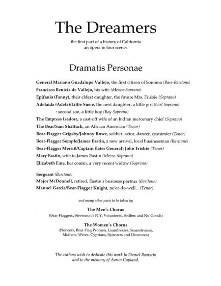 Subtitled “the first part of a history of California,” The Dreamers is a highly accessible opera about the dreams of American life, using as a springboard the dreams of one man, General Mariano Vallejo. Set primarily on two hot August days in 1848 in Sonoma, California- two years after the infamous Bear Flag Revolt that wrestled control of the Sonoma Valley from the Mexican government, created the California republic, and led quickly in turn to its absorption by the United States- The Dreamers depicts California as the place where people come to fulfill their dreams, and the dreams are as varied as those who dream them. The raising of the bear flag lingers as a nightmare in Vallejo's mind, while his daughter's fancy turns toward one of the handsome American soldiers. California seems big enough to hold the dreams of a lonely Indian woman, the last of her tribe, a black man who is trying to earn enough money as a gambler to buy his wife out of slavery, and a gay soldier searching for acceptance and understanding.