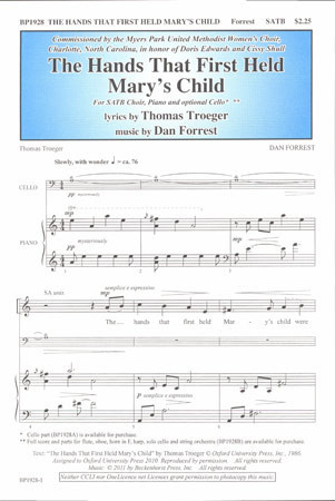 With lyrics by Thomas Troeger, The Hands that First Held Mary's Child explores the mystery of the incarnation, inspiring a sense of admiration at the relationship between Joseph and Jesus. Scored by Dan Forrest for chorus, piano, and optional cello or orchestral ensemble, this striking setting will become a Christmas Eve favorite.