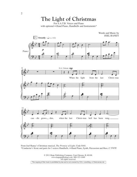 This original Joel Raney Christmas anthem incorporates two verses of “Silent Night” within the structure of a simple, charming ballad. It may be realized with a single piano accompaniment, or with the 4-hand piano part. Additional options include handbells, synth. , strings, percussion and bass. This setting comes from Joel's popular Christmas musical, The Promise of Light, and includes the opportunity for the congregation to join in on the carol.