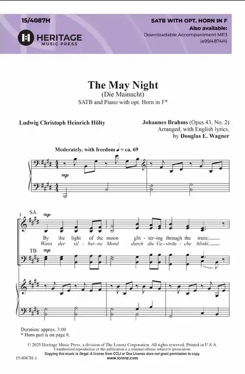 This German lieder featuring the enchanting music of Johannes Brahms has been arranged and adapted with new words by Douglas E. Wagner. The original German is included alongside the English adaptation, and the optional F horn part can be included for an additional layer of musicality that pairs beautifully with the tone of the piece.