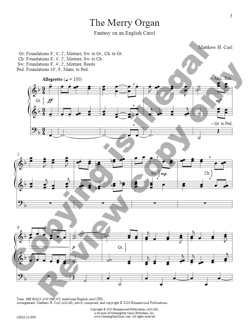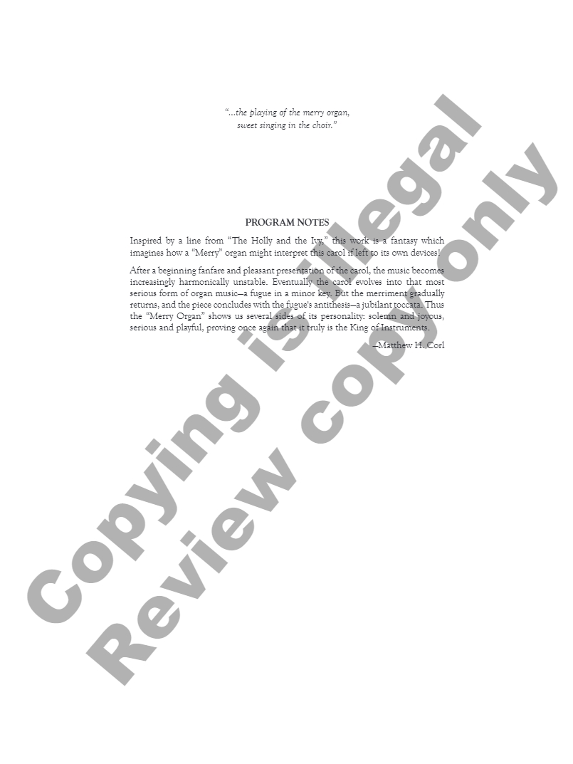 A line from the English carol “The Holly and the Ivy” serves as the inspiration and title for this delightful work. The “Merry Organ” presents the carol in styles idiomatic to the organ including fugue and toccata. Sure to be a wonderful addition to a holiday service or concert.