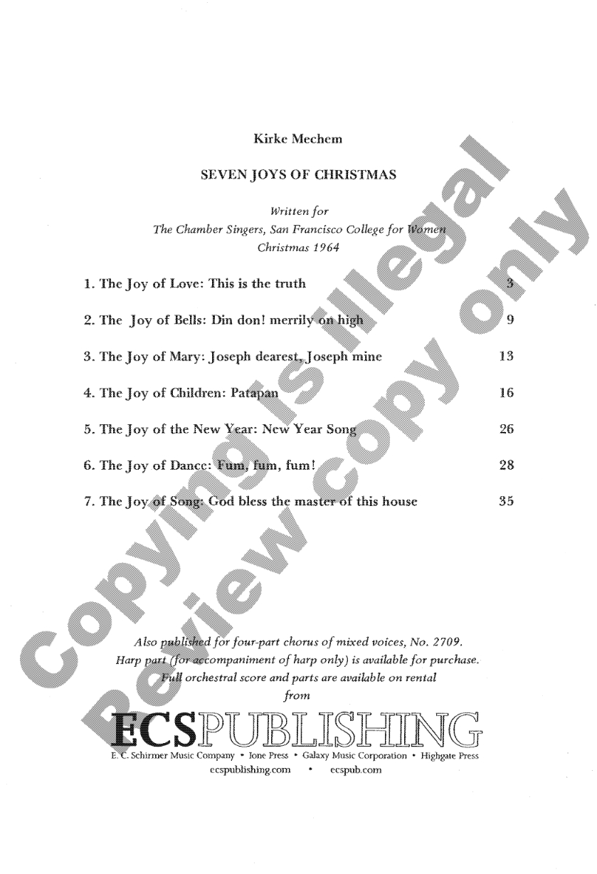 Kirke Mechem composed the Seven Joys of Christmas for the Chamber Singers of the San Francisco College for Women. He set out with the goal of setting lesser-known, but none the less attractive, carols from different countries in order to paint different aspects of joy for the Christmastide. He employed the number “Seven” because it is considered a magical number (as it is applies to mystery in the liturgy). The final carol, God bless the master of this house, is an amusing combination of all the carols in the composition, in addition to other well-known Christmastide melodies. In certain passages, two, three, even four different carols are being performed at the same time!