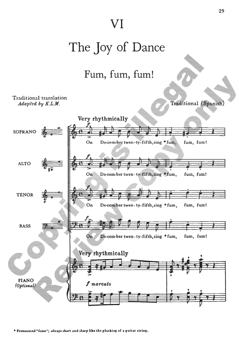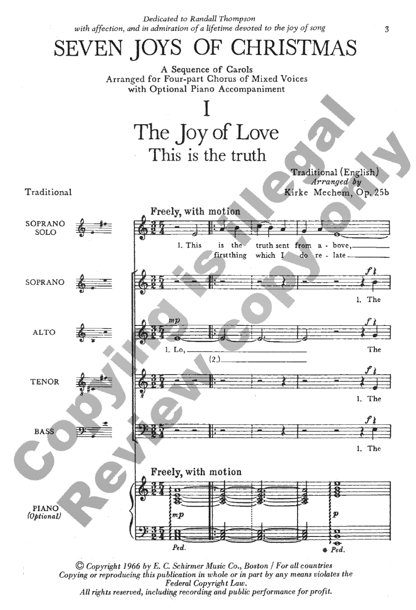 Kirke Mechem composed the Seven Joys of Christmas for the Chamber Singers of the San Francisco College for Women. He set out with the goal of setting lesser-known, but none the less attractive, carols from different countries in order to paint different aspects of joy for the Christmastide. He employed the number “Seven” because it is considered a magical number (as it is applies to mystery in the liturgy). The final carol, God bless the master of this house, is an amusing combination of all the carols in the composition, in addition to other well-known Christmastide melodies. In certain passages, two, three, even four different carols are being performed at the same time!