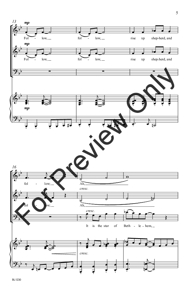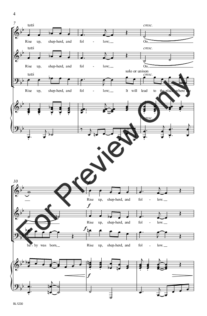 Here's a swingin' gospel treatment of Rise Up, Shepherd, And Follow that your ensemble will enjoy singing year after year! It's a great confidence-builder, an exciting audience-pleaser, and just plain fun for all involved!