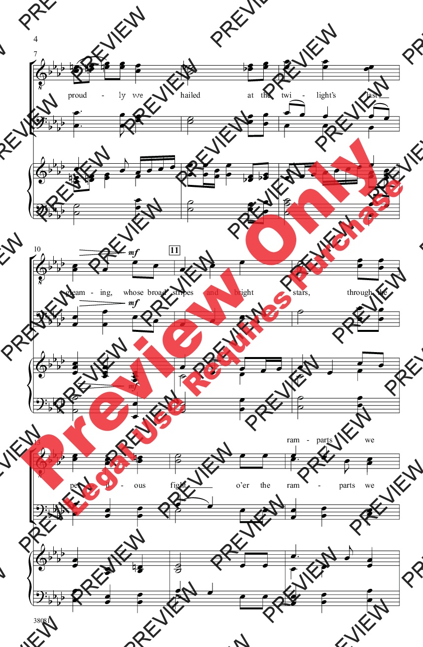 An exhilarating tour-de-force setting of our National Anthem. The sizable full orchestration, impressive piano accompaniment, and resounding choral parts emanate unwavering patriotism. Mark's arrangement works equally well in the concert hall, sanctuary, gym, or stadium.