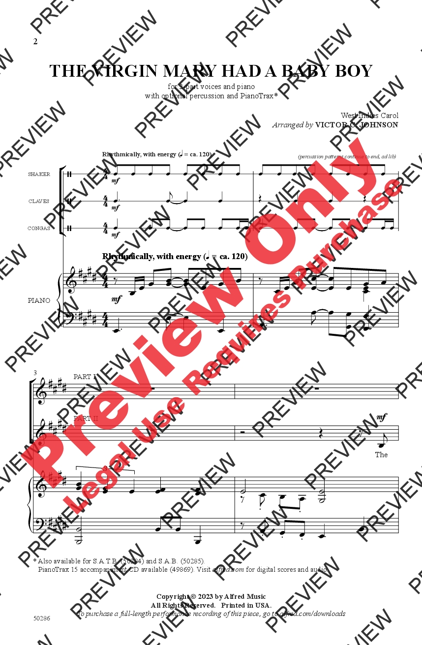 Victor C. Johnson pens a fresh, vibrant arrangement of this favorite West Indies carol. Whether sung in school or church, your lowest voices have a chance to shine, joyfully calling “he come down” to anchor many buoyant refrains. Perform with shaker, claves, and congas to enhance the rhythmic flavor of this bright Caribbean song.