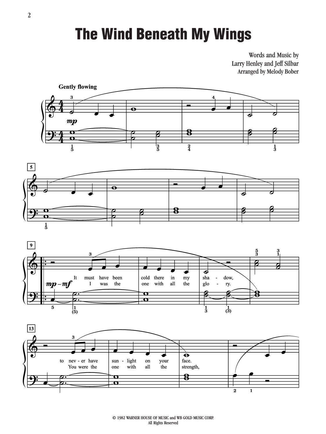 Bette Midler recorded the Grammy® Award-winning The Wind Beneath My Wings for the 1988 film Beaches. Since then, the song has become one of the most popular ballads ever written. This arrangement by Melody Bober retains the soaring melody of the original song, yet is accessible to late elementary piano students. Fingering, phrasing, lyrics and dynamics are included.