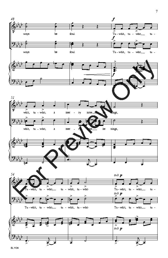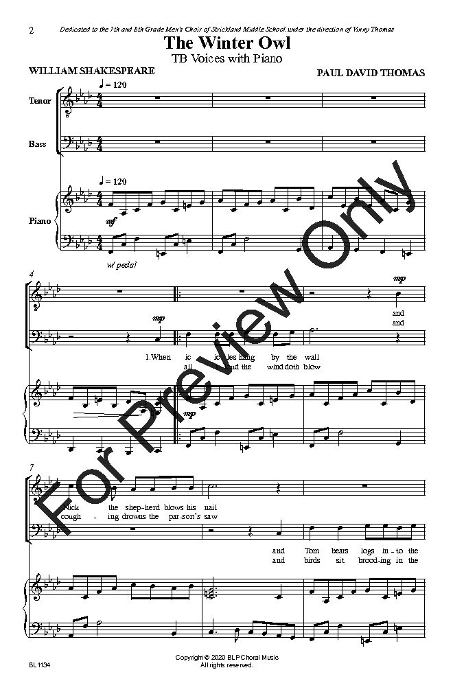 Thomas' compelling setting of The Winter Owl, adapted from a play by William Shakespeare, vividly describes the winter season and how both humankind and animals deal with the frigid temperatures and chilling wind. All the while, a solitary owl hoots merrily in the distance. Great for holiday or concert/festival season!