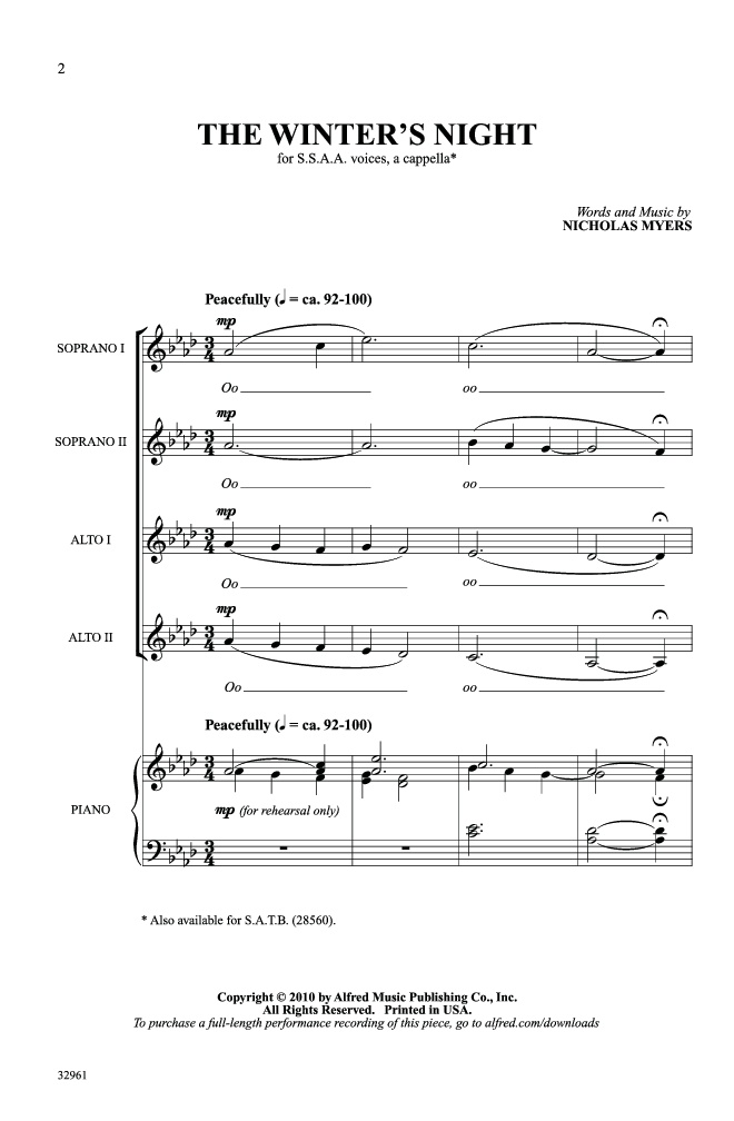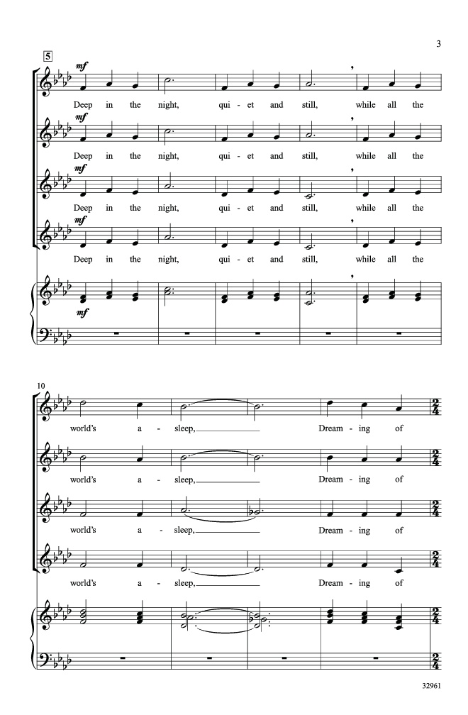 An outstanding choral work. Both the music and the strong lyrics evoke the sound and chill of a deep winter night, “quiet and still, while all the world's asleep . . . dreams pure as white, white as the snow.” Stunning. The choral writing is straightforward, yet fresh and contemporary. A concert choir work of great depth.