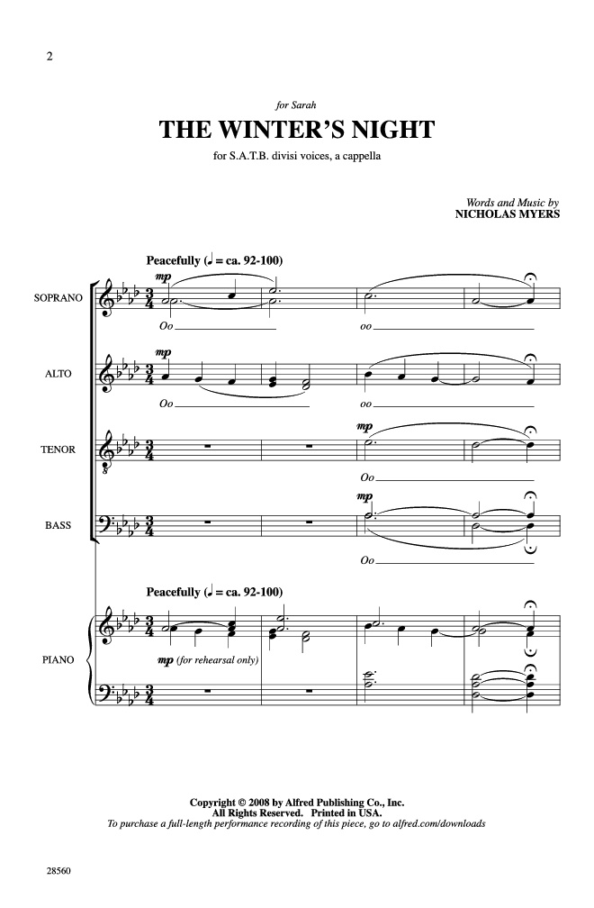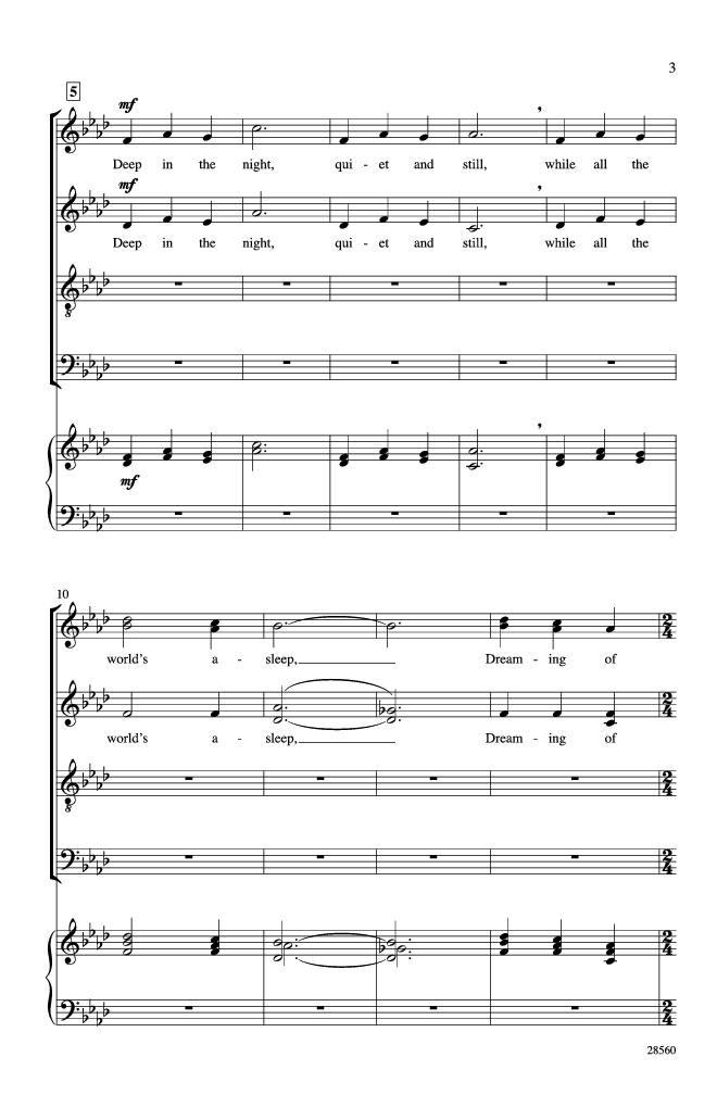 An outstanding choral work. Both the music and the strong lyrics evoke the sound and chill of a deep winter night, “quiet and still, while all the world's asleep . . . dreams pure as white, white as the snow.” Stunning. The choral writing is straightforward, yet fresh and contemporary. A concert choir work of great depth.