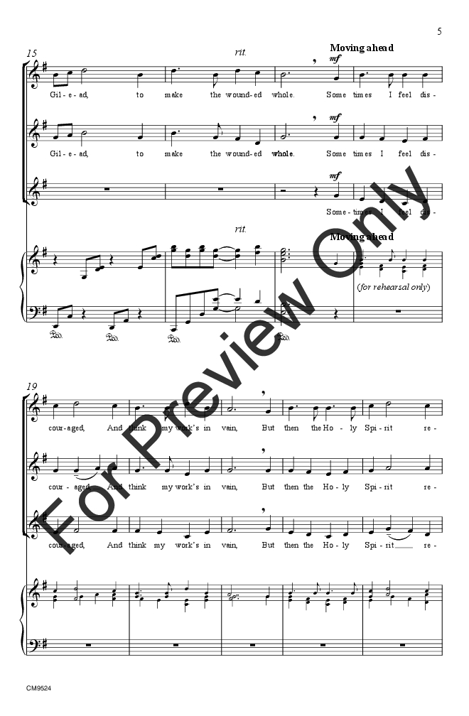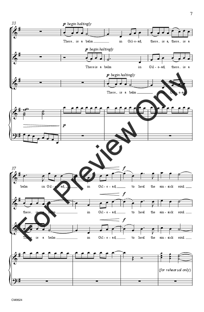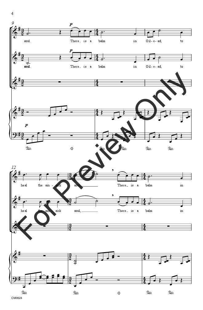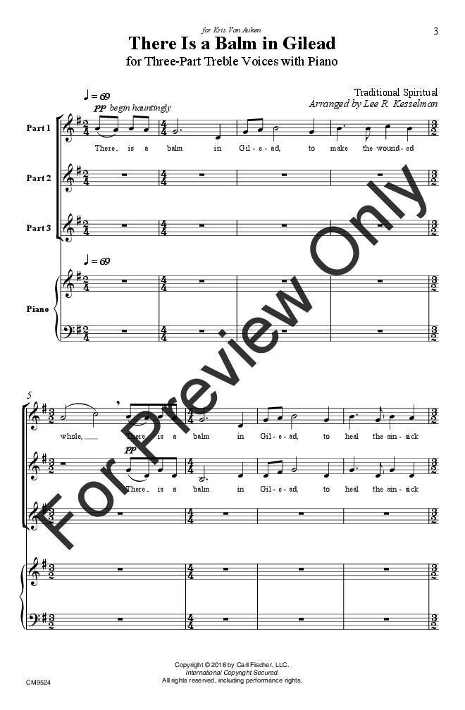 From the opening solo and duet passage to the a cappella three-part refrain, Lee Kesselman uses many textures in his transparent arrangement of this beloved African-American spiritual. Sure to touch the heart, inspire, give hope, and challenge, There is a Balm in Gilead is perfect for concerts and festivals.