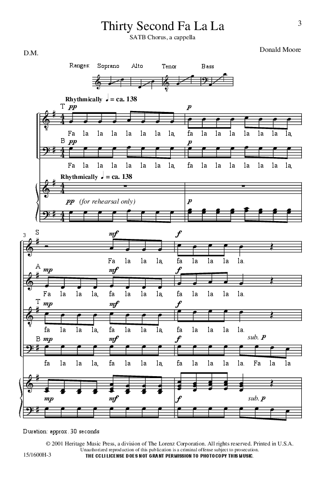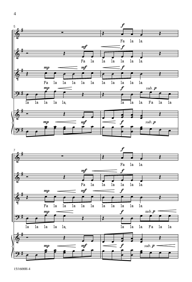 Yes, it only takes thirty seconds to perform this unique and tasty “Fa La La!” Creative programming at its best, this piece can also be utilized as an effective warm-up exercise and is a terrific vehicle for teaching chord building, independence of parts, and dynamic contrasts, as well as being an introduction to imitative style and a cappella singing.