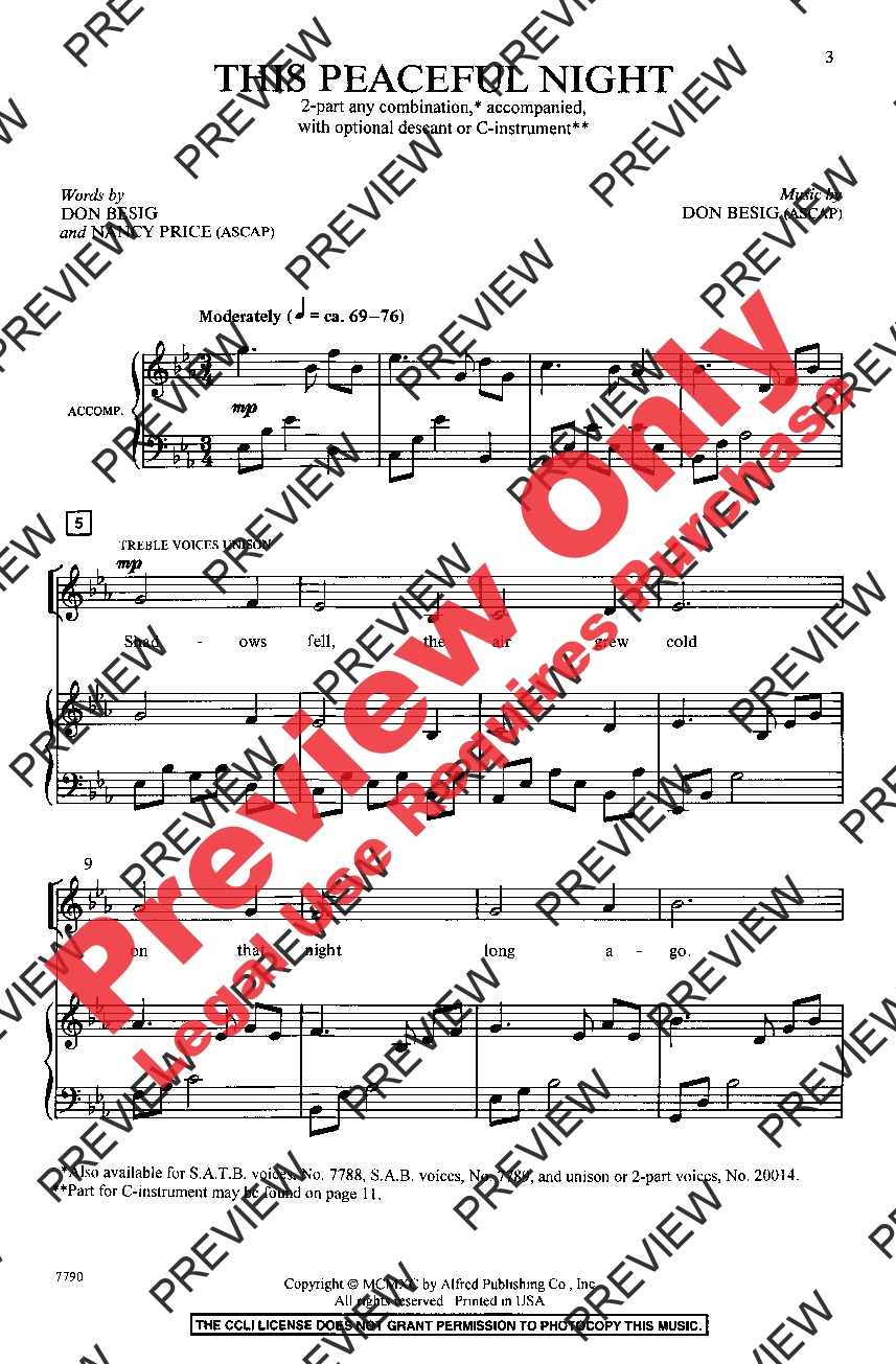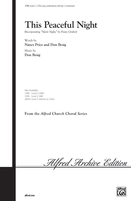 A captivating partnering of the beloved Christmas carol, Silent Night, Holy Night, with a gorgeous new melody by Nancy Price and Don Besig. The final soaring descant (opt. C-Instrument part included) adds a special touch. Available in four voicings for singers of all ages.