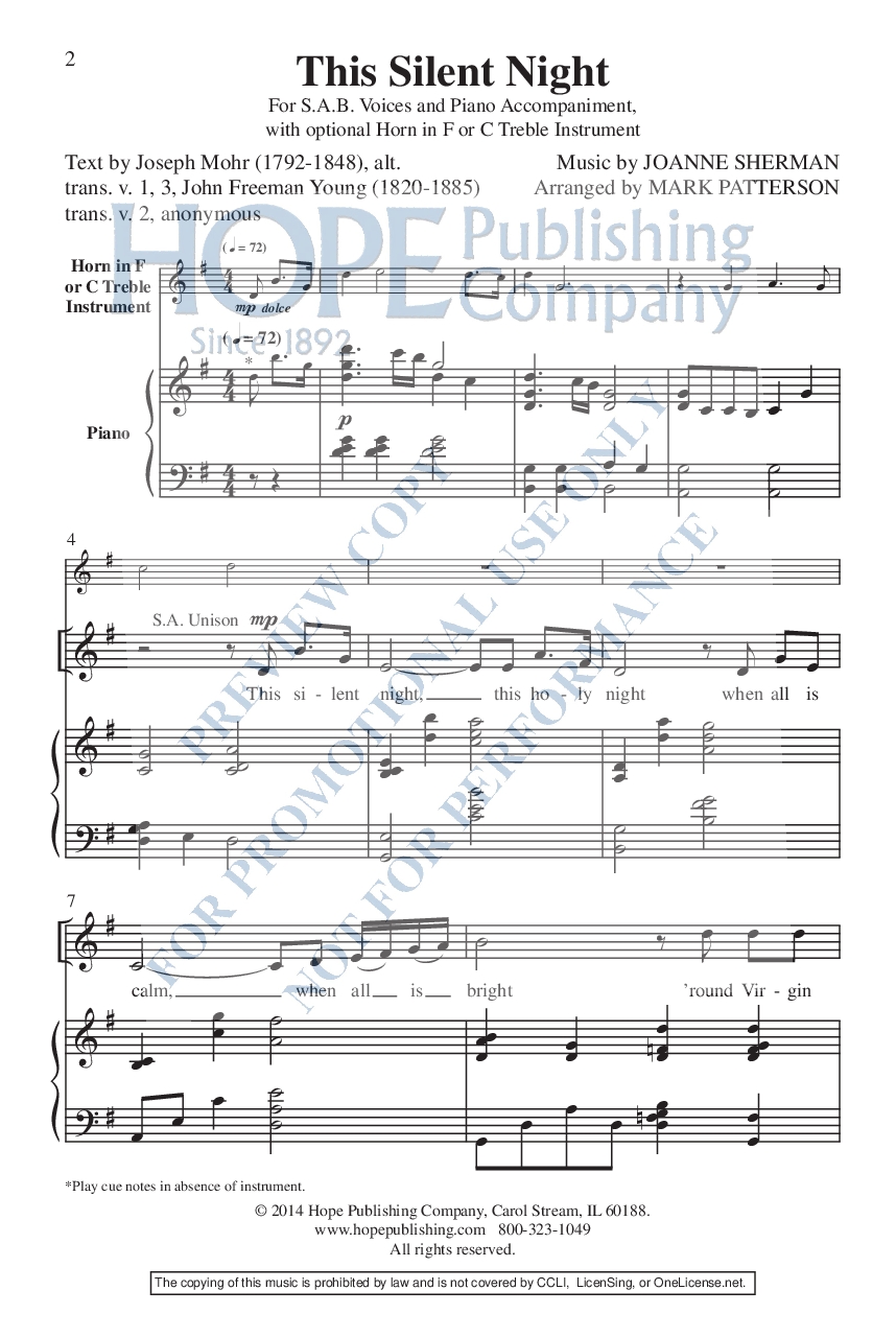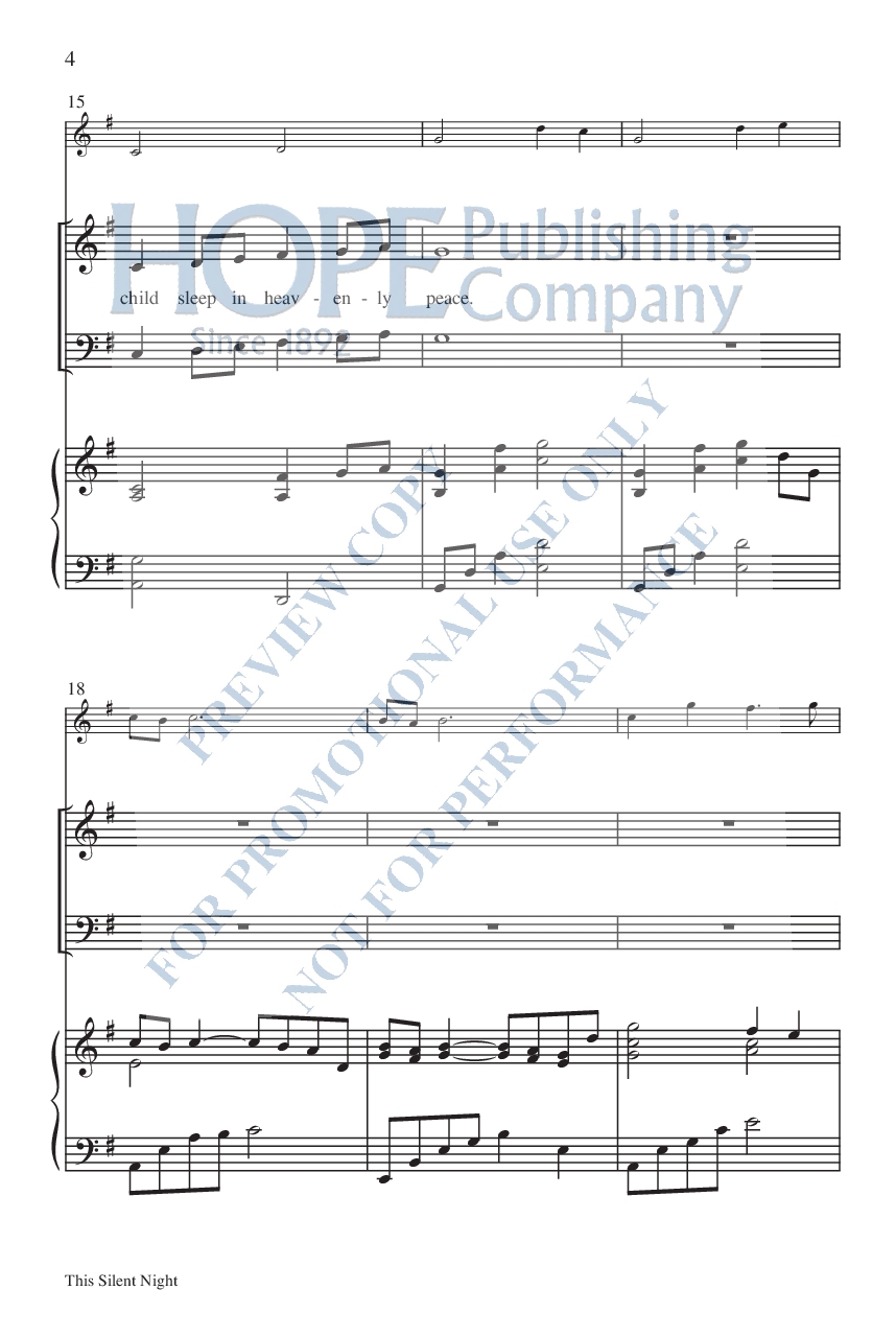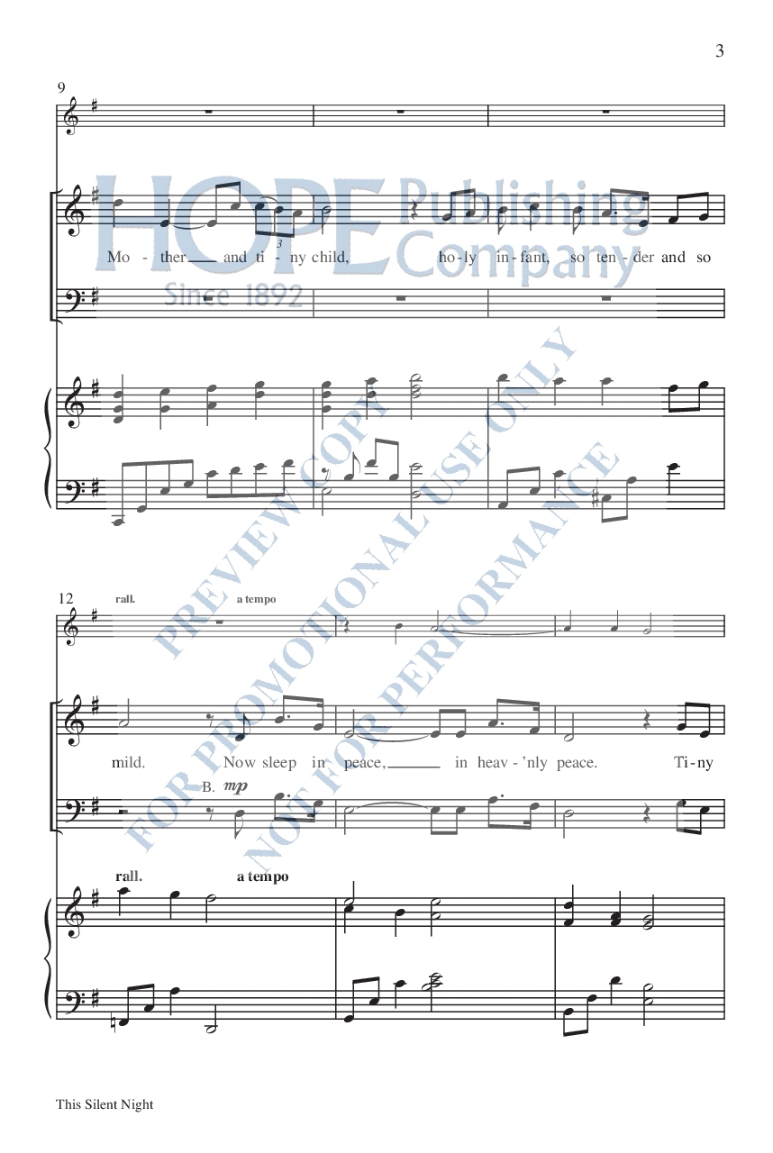 Arranger Mark Patterson takes the text from “Silent Night,” and makes it come to life with a beautifully lilting, original melody. Voices sing first in unison, and then expand into two- and three-part harmony. A lush piano accompaniment supports throughout and an optional Horn or C Instrument Part adds the perfect finishing touch.