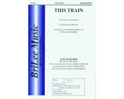 This Train is a well-known and loved spiritual. Its upbeat nature and quick tempo have resulted in many choral settings. Donald Moore’s arrangement for two-part male voices is rhythmic and fun to sing. The accompaniment simulates the forward motion of a train, complete with whistle. Keep the beat steady and don’t speed up. Have fun on this train!