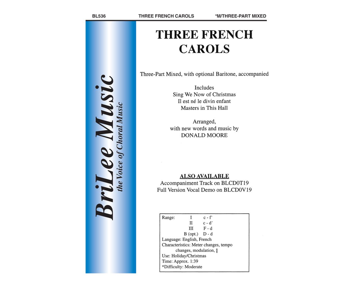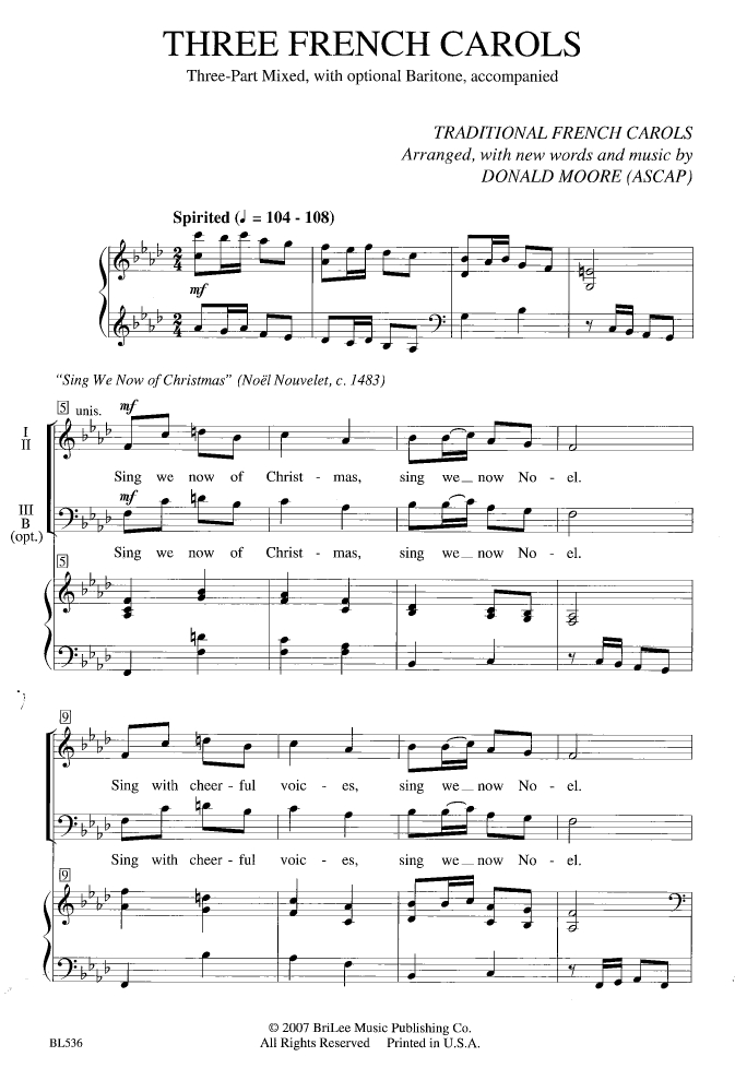 This joyful medley, with text almost entirely in English, includes Sing We Now of Christmas (Noel Nouvelet), Il est ne le divin enfant, and the French tune for Masters in This Hall. Skillfully crafted, with an easy transition into each carol, it maintains a high energy level throughout. The optional baritone part provides extra flexibility as boys' voices drop into the baritone range.