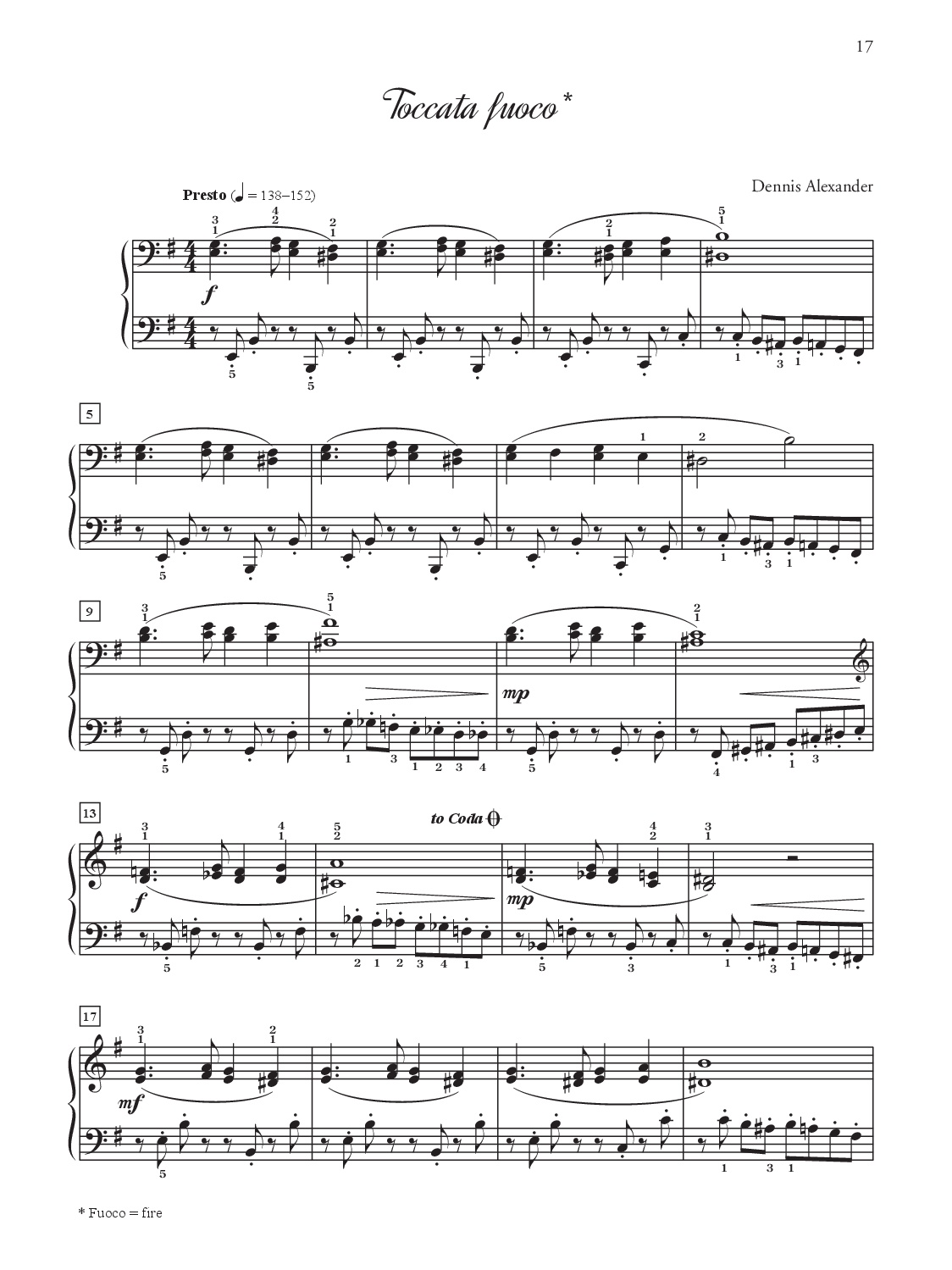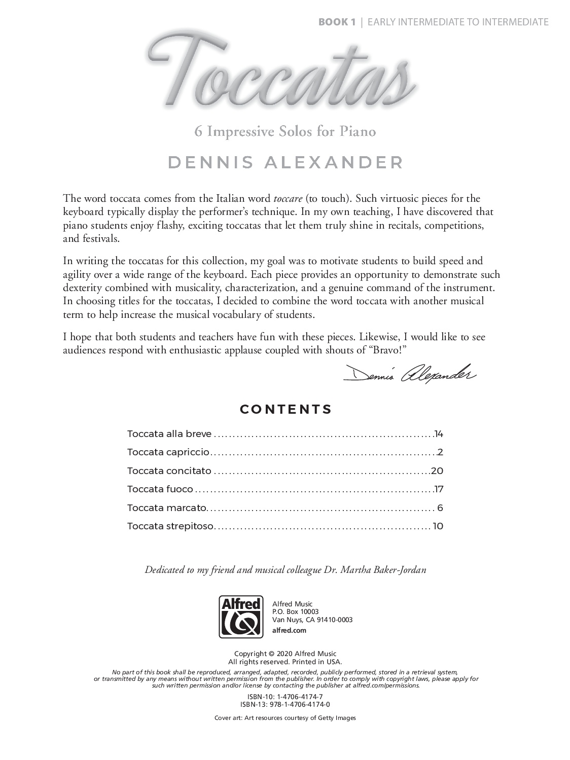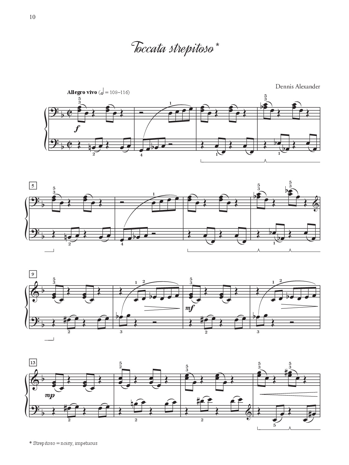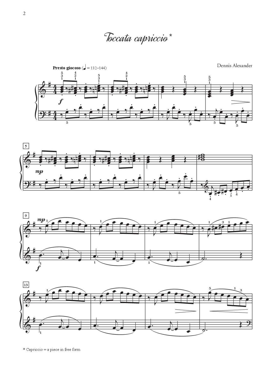The word “toccata” comes from the Italian word “toccare” (to touch). Such virtuosic pieces for the keyboard typically display the performer's technique. Each piece in this collection provides an opportunity to demonstrate dexterity combined with musicality, characterization, and a genuine command of the instrument. These flashy, exciting toccatas will let students shine in recitals, competitions, and festivals.